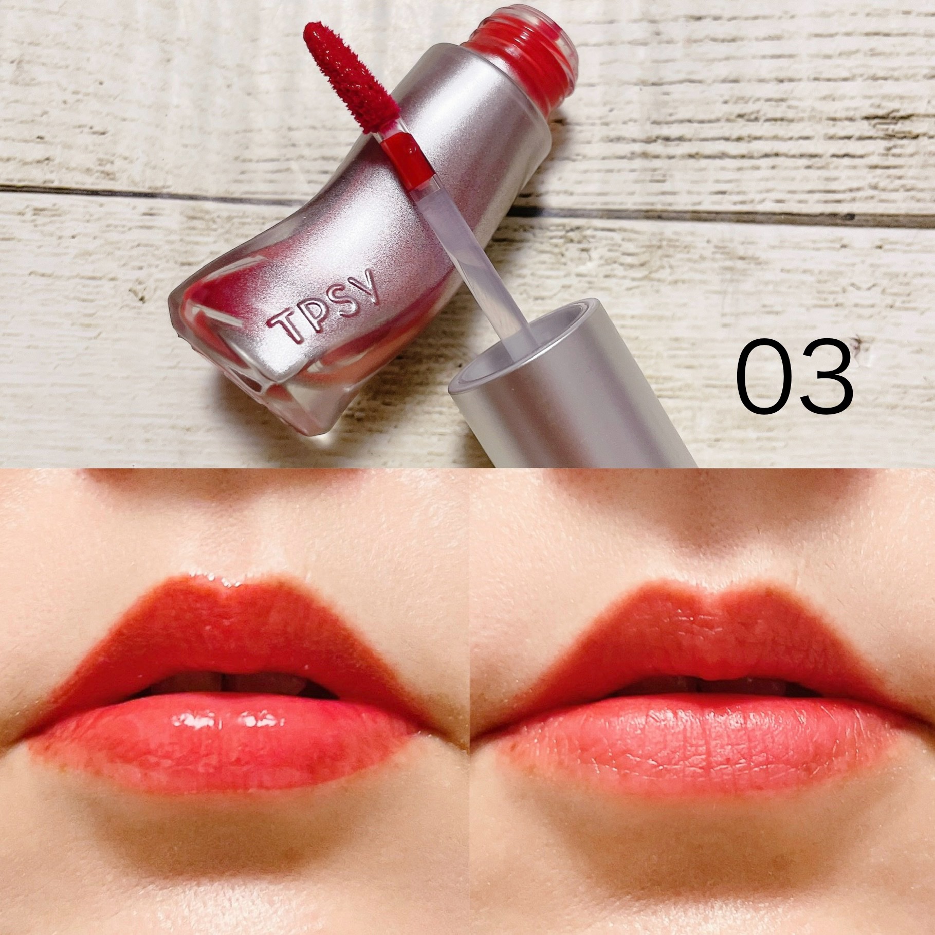 水分をふくんだコンディション成分79%配合でしっとり感をキープするウォータージェル&オイルフォーミュラリッププランパーティント。 03ワイルドは、イエベ春さんにピッタリなブライトコーラル。 わたしがつけると、ピンクコーラルて感じでピンクグレープフルーツカラーに感じた!! 付け心地いいし、色持ちよくてぷるぷる🩵