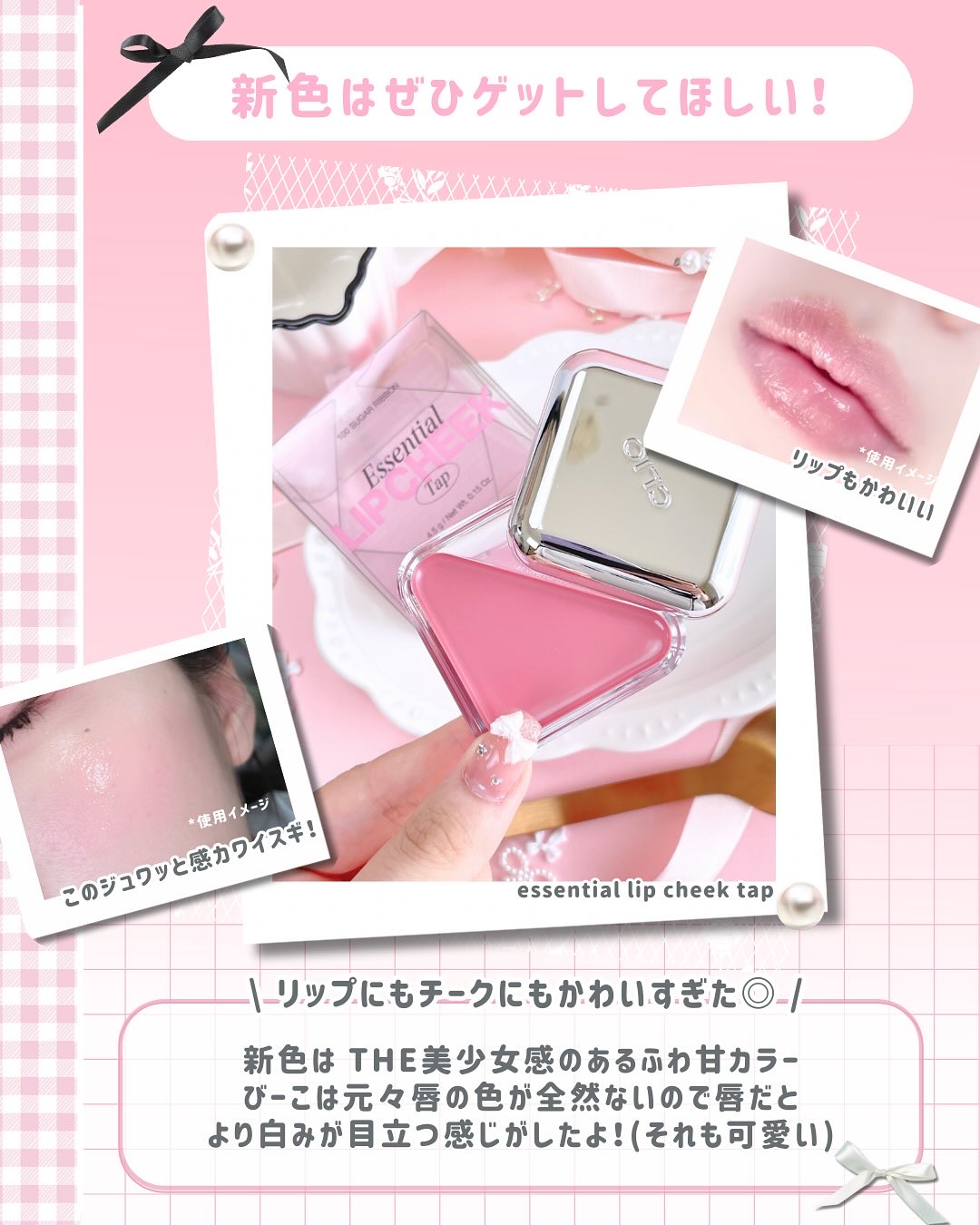 \咥えるチークに日本限定カラー🎀🤍/以前紹介したエッセンシャルリップチークタップに新色”孫亜妃ちゃん共同開発カラー”が発売💗ふんわり甘く、きゅんをひとさじしたようなローズピンクカラーの【100シュガーリボン🎀🤍】使用前は結構白みピンクカラーに...