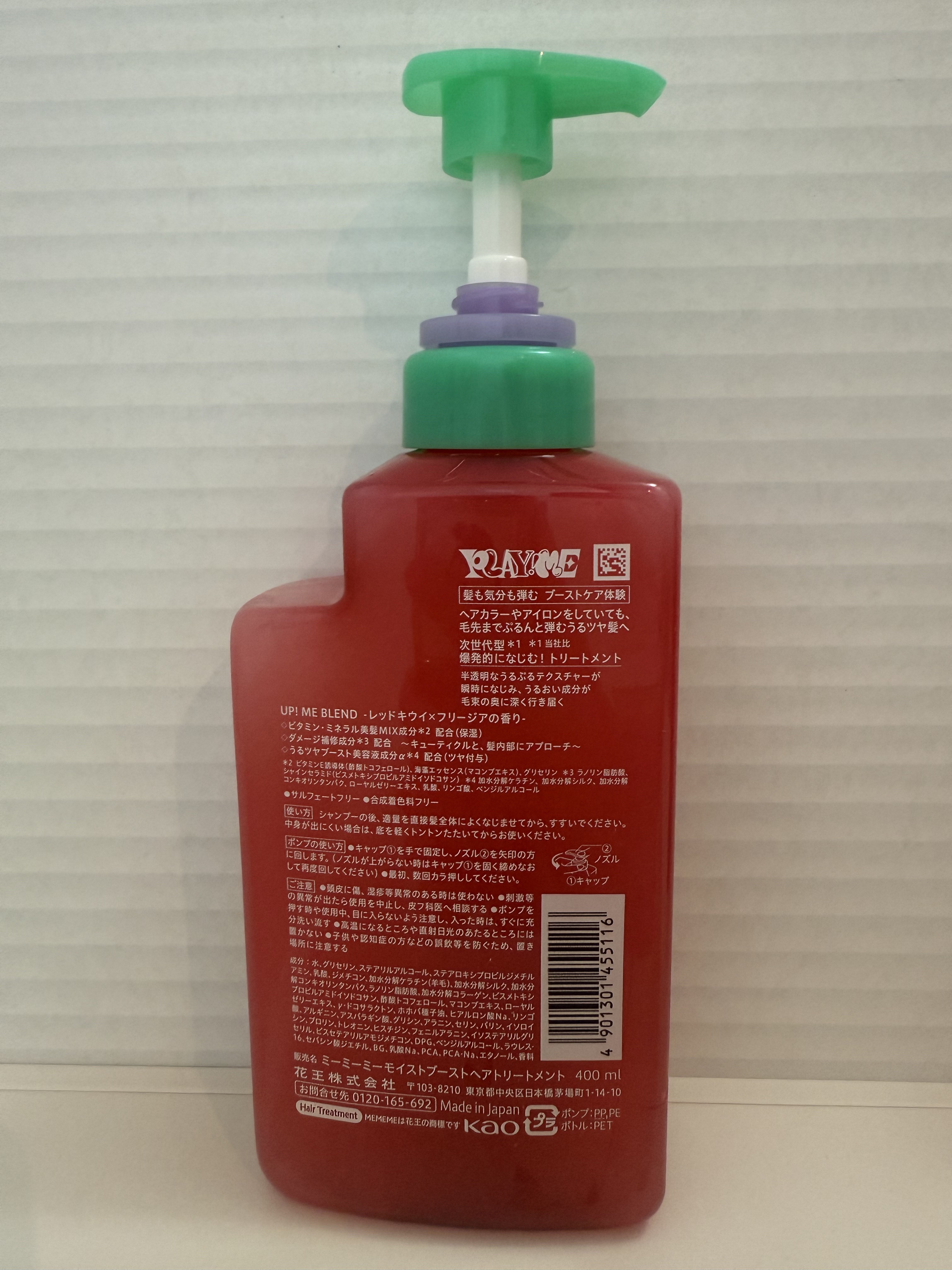 - ヘアカラーやアイロンをしていても、毛先までぷるんと弾む自信がみなぎるうるツヤ髪へ 【モイストブーストシャンプー】 ・すぐにモコモコ泡立ち、サッとすすげる! ・うるおい感は残しながらすっきり洗える ・髪を均一に守るベースアップ技術採用 【モイストブーストトリートメント】 次世代型*¹ 素早く一気になじむトリートメント。 ・半透明なうるぷるテクスチャーが瞬時になじみ、うるおい成分が毛束のすみずみまで行き届く ●サルフェートフリー ●合成着色料フリー シャンプーのみ:●ノンシリコーン処方 ●アミノ酸系洗浄成分使用*² UP! ME BLEND レッドキウイ×フリージアの香り ◇ビタミン・ミネラル美髪MIX成分*³配合(保湿) ◇うるツヤブースト美容液成分α*⁴配合(ツヤ付与) ◇ダメージ補修成分*⁵ ~キューティクルと、髪内部にアプローチ~ *1 花王内 *2 ココイルメチルタウリンNa、ラウロイルメチルアラニンNa、ラウロイルサルコシンTEA *3 ビタミンE誘導体(酢酸トコフェロール)、海藻エッセンス(マコンブエキス)、ポリクオタニウム-52(シャンプーのみ)、グリセリン(トリートメントのみ) *4 加水分解ケラチン、加水分解シルク、加水分解コンキオリンタンパク、ローヤルゼリーエキス、乳酸、リンゴ酸、ベンジルアルコール *5 ラノリン脂肪酸、シャインセラミド(ビスメトキシプロピルアミドイソドコサン)、PPG-3カプリリルエーテル(シャンプーのみ)
