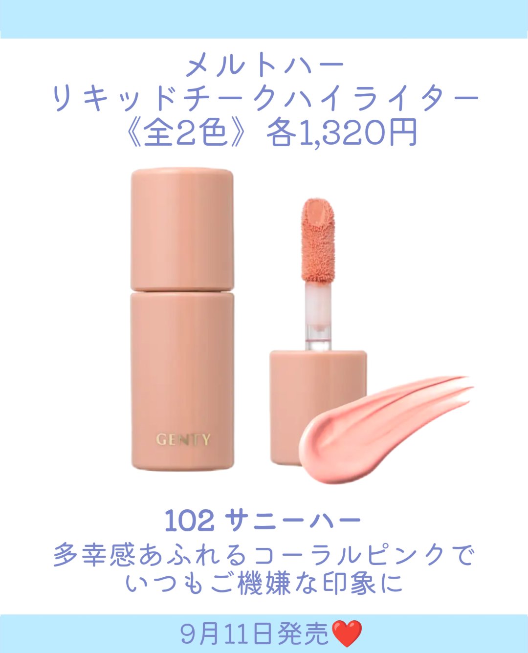 なごみちゃんプロデュースのコスメブランドGENTYから新作のリキッドチークインハイライターが登場🫧⚜️GENTYジェンティーメルトハーリキッドチークハイライター101ロージーミー/102サニーハーじゅわっと色づくシアーな発色と頬に自然に光が入...