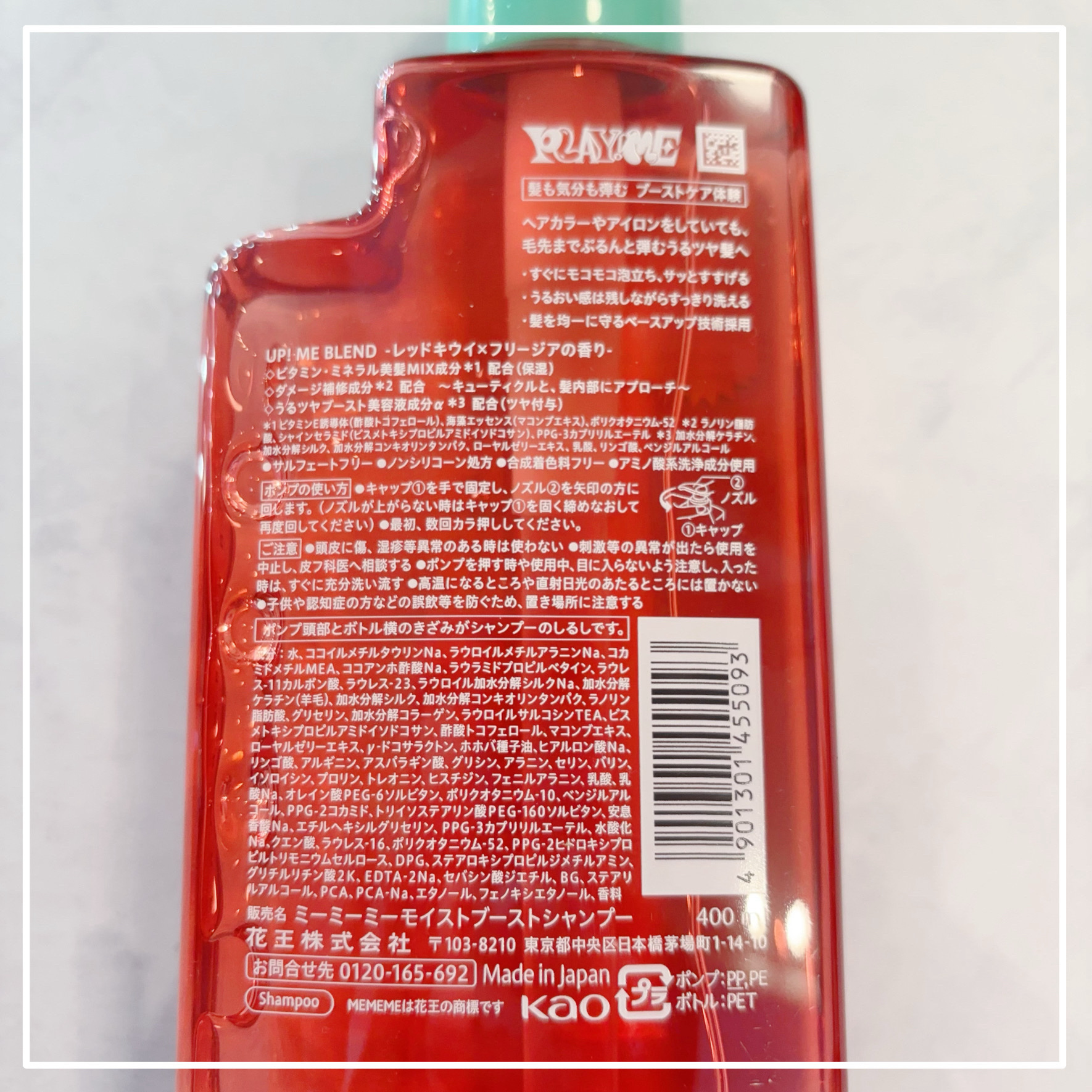 - ヘアカラーやアイロンをしていても、毛先までぷるんと弾む自信がみなぎるうるツヤ髪へ 【モイストブーストシャンプー】 ・すぐにモコモコ泡立ち、サッとすすげる! ・うるおい感は残しながらすっきり洗える ・髪を均一に守るベースアップ技術採用 【モイストブーストトリートメント】 次世代型*¹ 素早く一気になじむトリートメント。 ・半透明なうるぷるテクスチャーが瞬時になじみ、うるおい成分が毛束のすみずみまで行き届く ●サルフェートフリー ●合成着色料フリー シャンプーのみ:●ノンシリコーン処方 ●アミノ酸系洗浄成分使用*² UP! ME BLEND レッドキウイ×フリージアの香り ◇ビタミン・ミネラル美髪MIX成分*³配合(保湿) ◇うるツヤブースト美容液成分α*⁴配合(ツヤ付与) ◇ダメージ補修成分*⁵ ~キューティクルと、髪内部にアプローチ~ *1 花王内 *2 ココイルメチルタウリンNa、ラウロイルメチルアラニンNa、ラウロイルサルコシンTEA *3 ビタミンE誘導体(酢酸トコフェロール)、海藻エッセンス(マコンブエキス)、ポリクオタニウム-52(シャンプーのみ)、グリセリン(トリートメントのみ) *4 加水分解ケラチン、加水分解シルク、加水分解コンキオリンタンパク、ローヤルゼリーエキス、乳酸、リンゴ酸、ベンジルアルコール *5 ラノリン脂肪酸、シャインセラミド(ビスメトキシプロピルアミドイソドコサン)、PPG-3カプリリルエーテル(シャンプーのみ)
