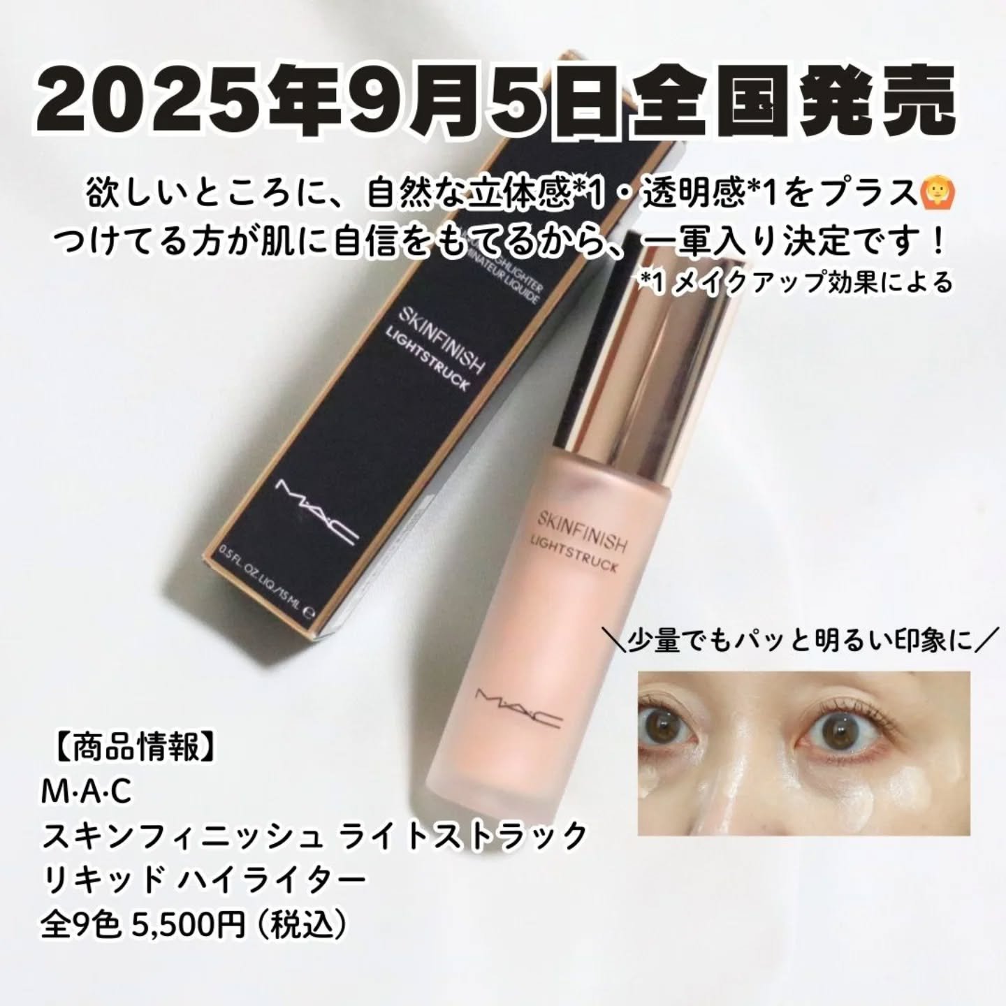 - M・A・Cのベストセラーハイライト『ライトスカペード』から革新的に進化したリキッドタイプが誕生! さりげなく照らすツヤめきで、どの角度の自分も好きになる 【うるおうのにヨレにくい 超薄膜リキッドハイライト】 スキンフィニッシュ ライトストラック リキッド ハイライター 全9色展開/税込5,500円 2025年8月22日 (金) 楽天市場 M·A·C公式ショップ / ZOZOTOWN M·A·C 先行予約 2025年9月1日 (月) @cosme SHOPPING 先行発売 2025年9月3日 (水) 阪急うめだ本店 先行発売 2025年9月5日 (金) 全国店舗 / M·A·C公式オンラインショップ / 楽天市場 M·A·C公式ショップ / ZOZOTOWN M·A·C 発売 ■ベスコス17冠『ライトスカペード』からリキッドが誕生 ギラつかず、上品なツヤが唯一無二の輝きを生み出す大人気のハイライトが、 うるおいとリアルなツヤ感をまとって進化。 ■85%スキンケアベース*¹。セラム級のうるおいが続く スクワラン*²配合。美容液のような付け心地で、みずみずしいツヤ感のある印象に。 ■ベタつかず、ヨレにくい。仕上がりが12時間持続*³ するする伸びて、薄膜でぴたっと密着。ヨレにくく、ベタつきを感じにくい。 ■どの角度からも美しく。内から輝く“仕込み”付け*⁴ メイクの仕上げに使うだけでなく、化粧下地の後に広めに仕込むことで個々の骨格を引き立たせ、どこから見ても自信が持てる肌へ。 ■自分らしく選べる9色展開で 楽しみ方は無限大 スキントーンや気分に合わせてニュアンスチェンジ。あなただけのメイクの引き出しを広げて。 *¹ スキンケアベースとは、着色剤、製品の防腐剤や安定剤を除く、水や保湿成分、皮膚コンディショニング成分を含んだベースで構成されていること *² 保湿成分 *³ 化粧持ちデータ取得済(当社調べ/個人差があります) *⁴ メイクアップ効果による #美容液級ライトスカペード #超薄膜リキッドハイライト
