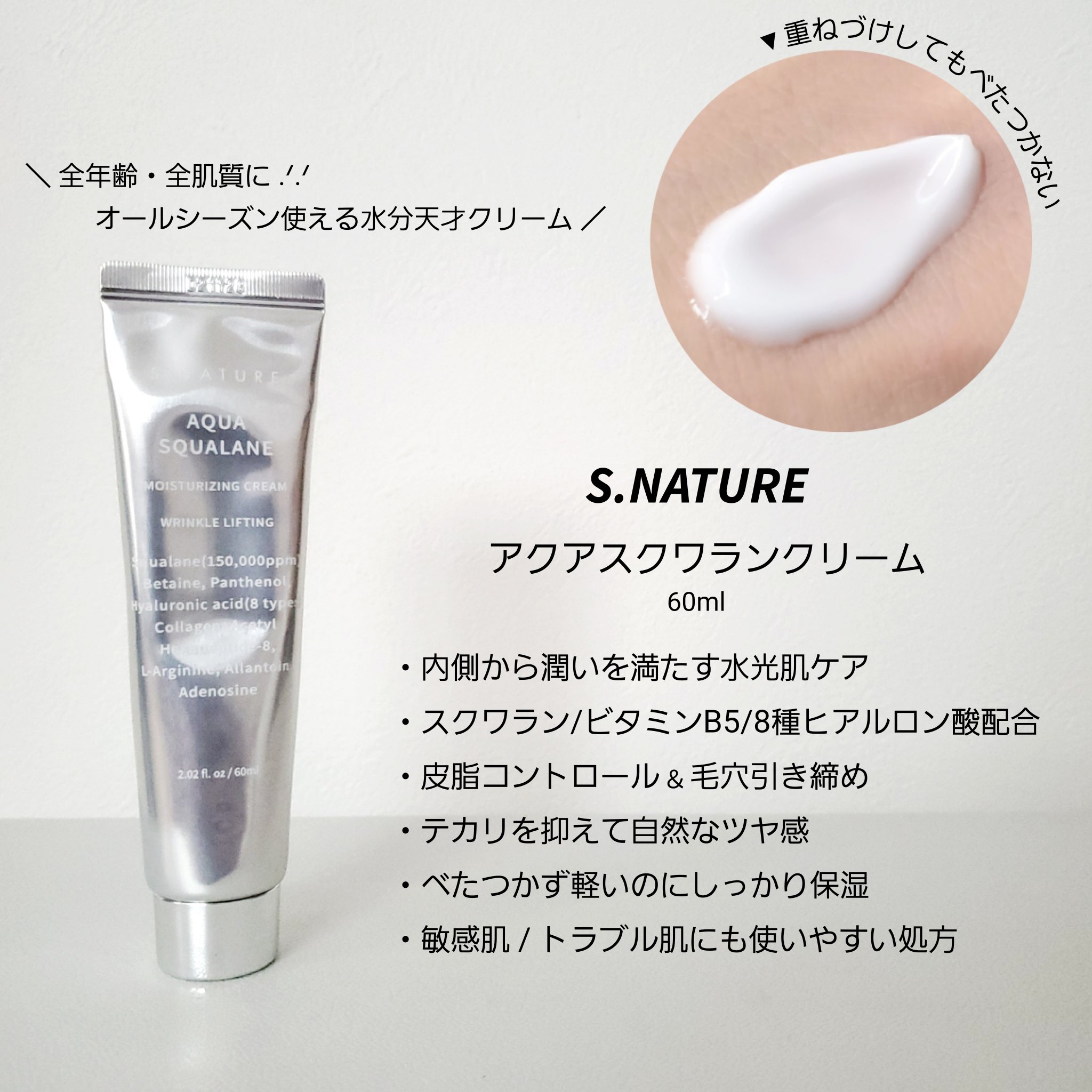 S.NATUREAQUASQUALANEMOISTURIZINGCREAM※韓国オリーブヤングで人気no.1モイスチャークリーム・ファヘアワード37冠達成の人気韓国クリーム✨※水分天才クリームと言われ、朝、夜、いつでも使えます!ベタつかず軽め...