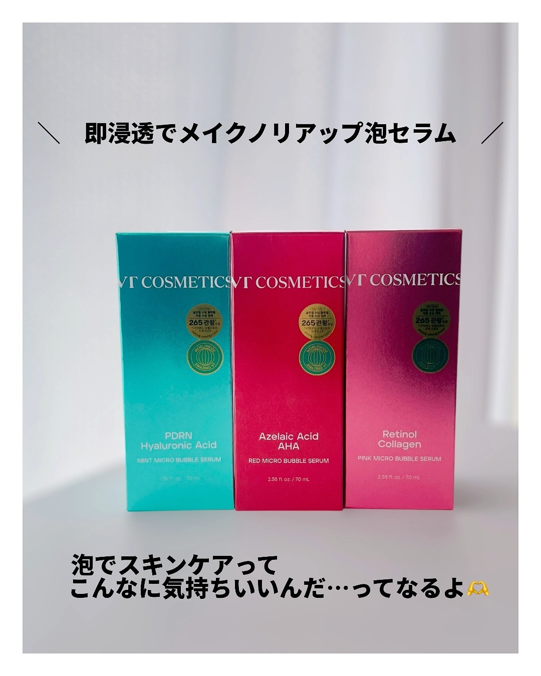 \浸透力11倍アップ泡セラム/VTから新商品が登場しました👏♡🫧マイクロバブルセラム🫧今回3種類のバブルセラムを紹介します✨ふわふわの泡がジュワッとお肌に浸透する〜って感覚になりました🥺🫧①AZAHAレッドマイクロバブルセラムVT独自の割合で...