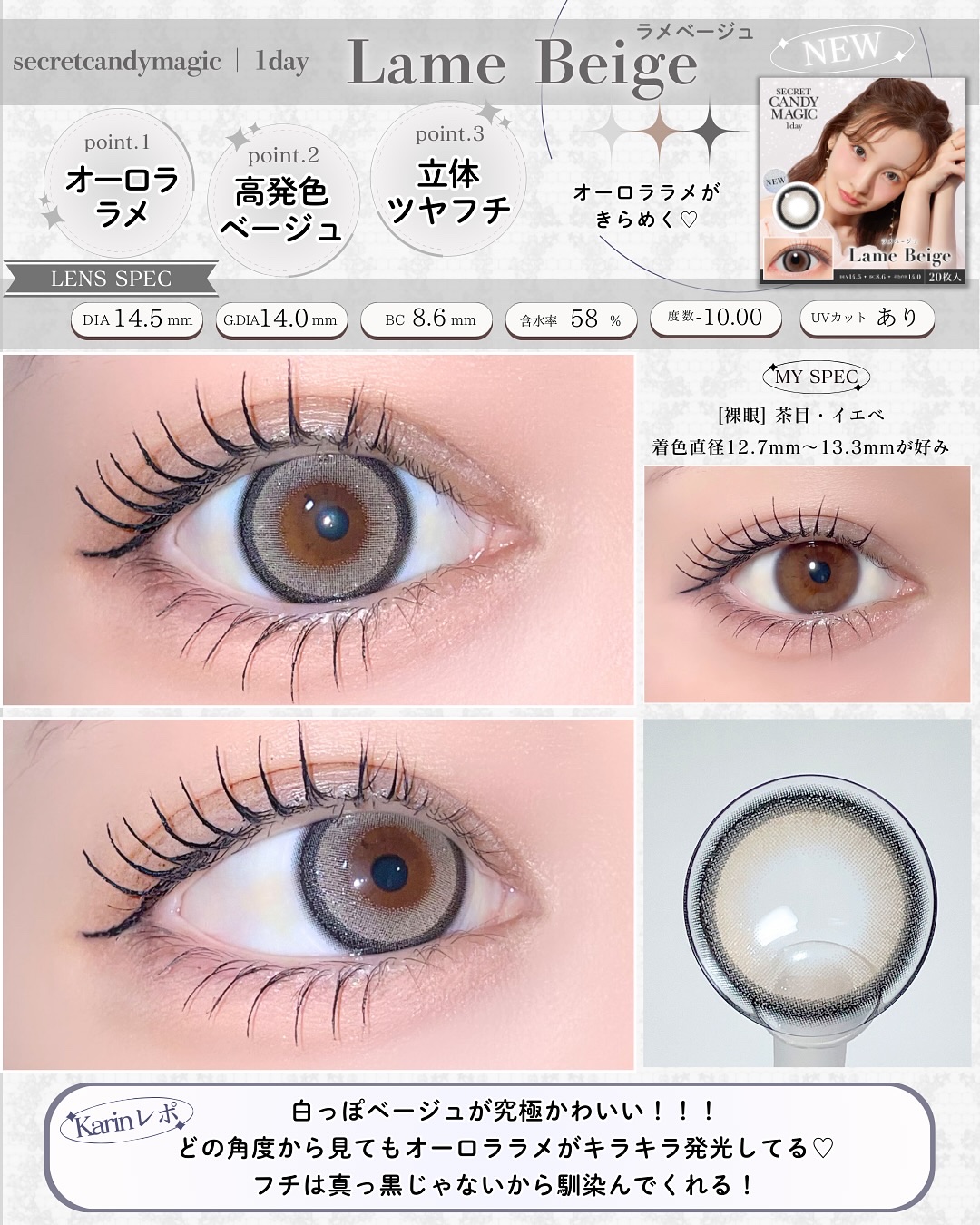 secretcandymagic(シークレットキャンディーマジック)にキラキラ発色の“ラメ入りカラコン”が9/1(月)新登場!✔︎︎︎︎ラメベージュメインのくすみベージュにオーロララメ。グレーっぽさもあって高発色で映える瞳に✨️✔︎︎︎︎ラメ...