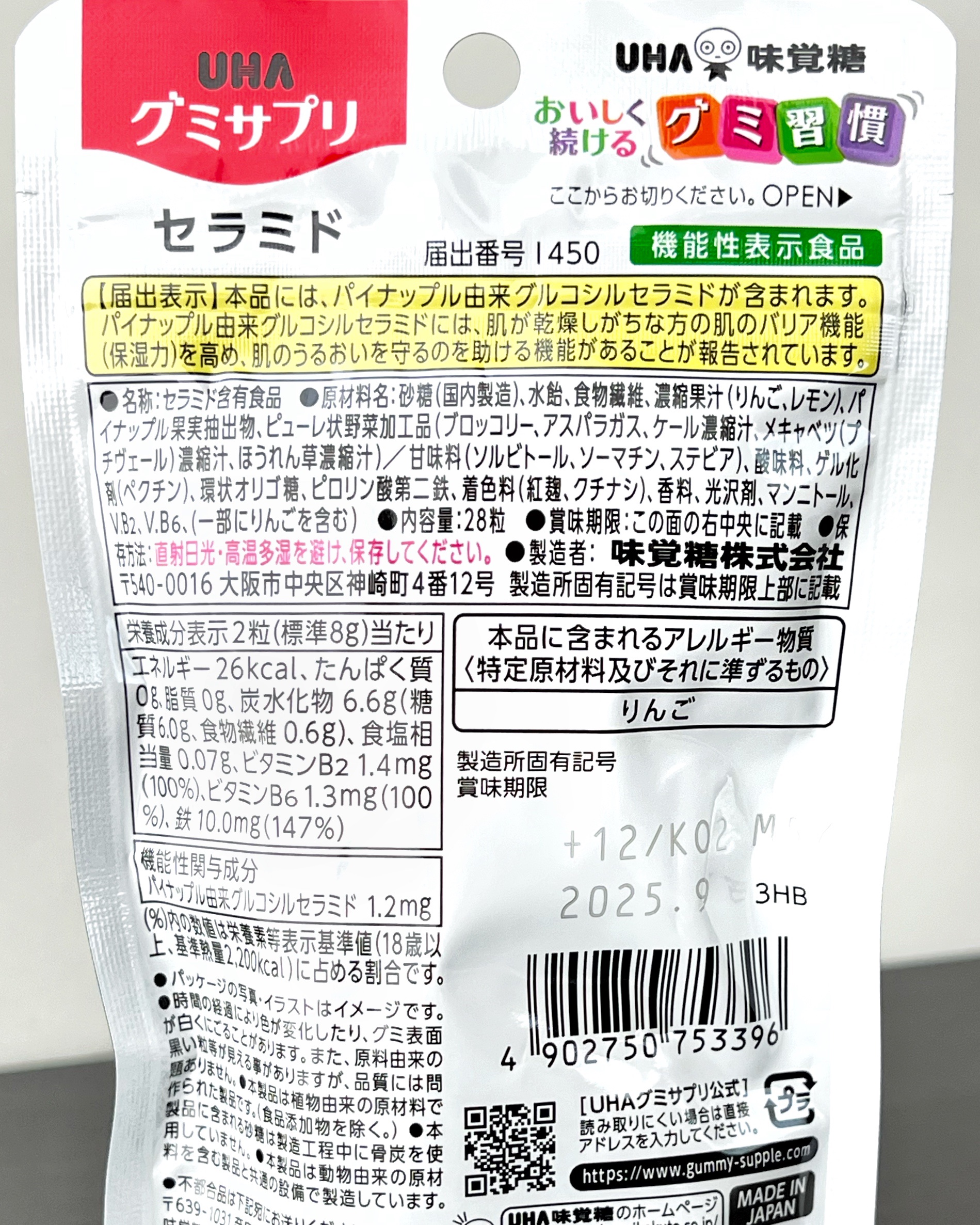 UHA味覚糖UHAグミサプリ セラミド20粒¥1,110買った後でドンキでかなり安くなってるの見つけて膝から崩れ落ちた。グミというか琥珀糖の中みたい。味はパイナップルが来て後味にスムージーの苦味。スムージー苦手なのでちょっと厳しい。ビタミンB...