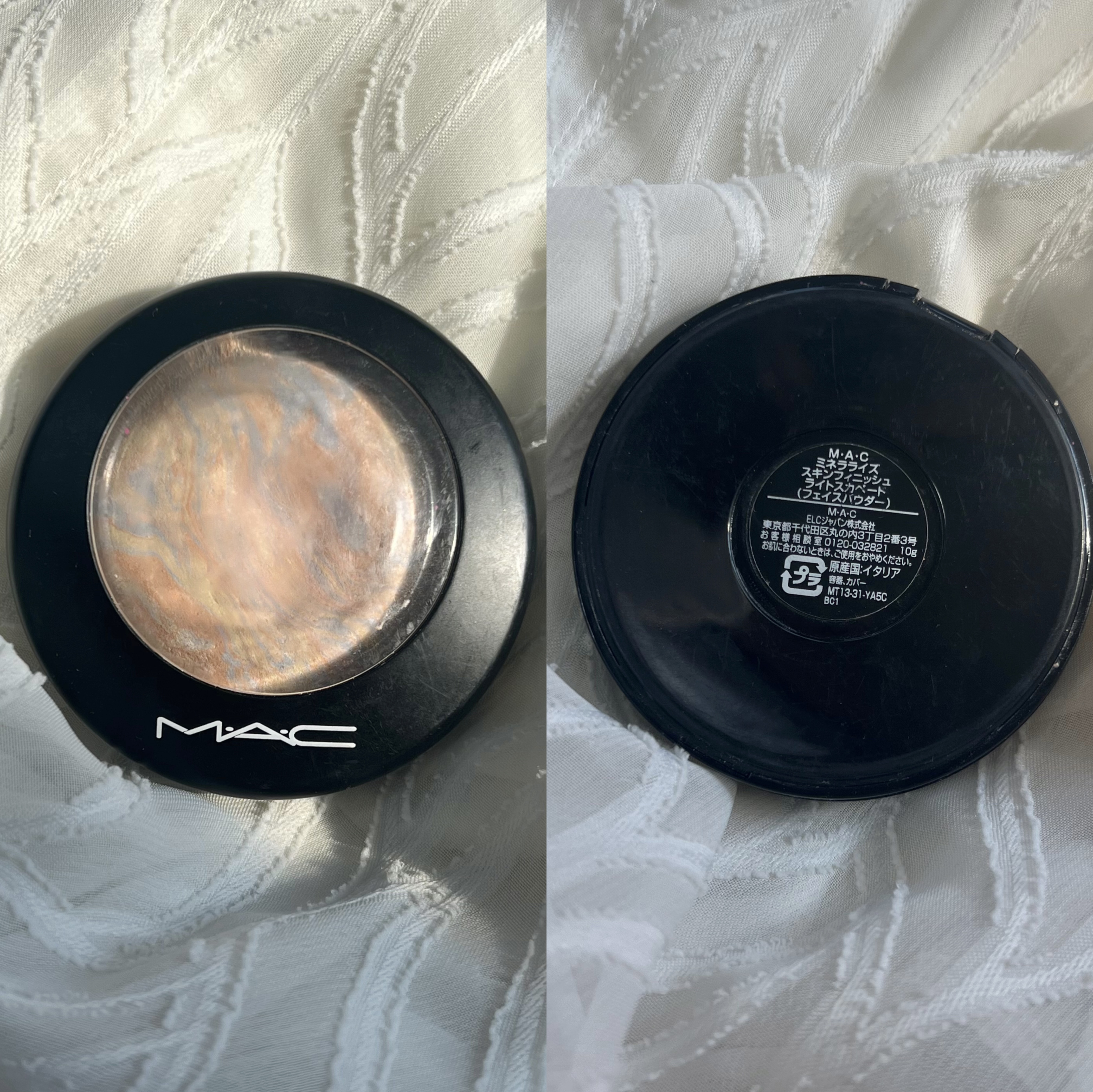 【やっぱりすごかった😳大・大・大人気のハイライトGETしました💓🙌】ライトスカペードは、M·A·Cのフェイスパウダーミネラライズスキンフィニッシュシリーズの中でも透明感のあるハイライトとして人気のアイテム✨ブルー・ピンク・ベージュのマーブル模...