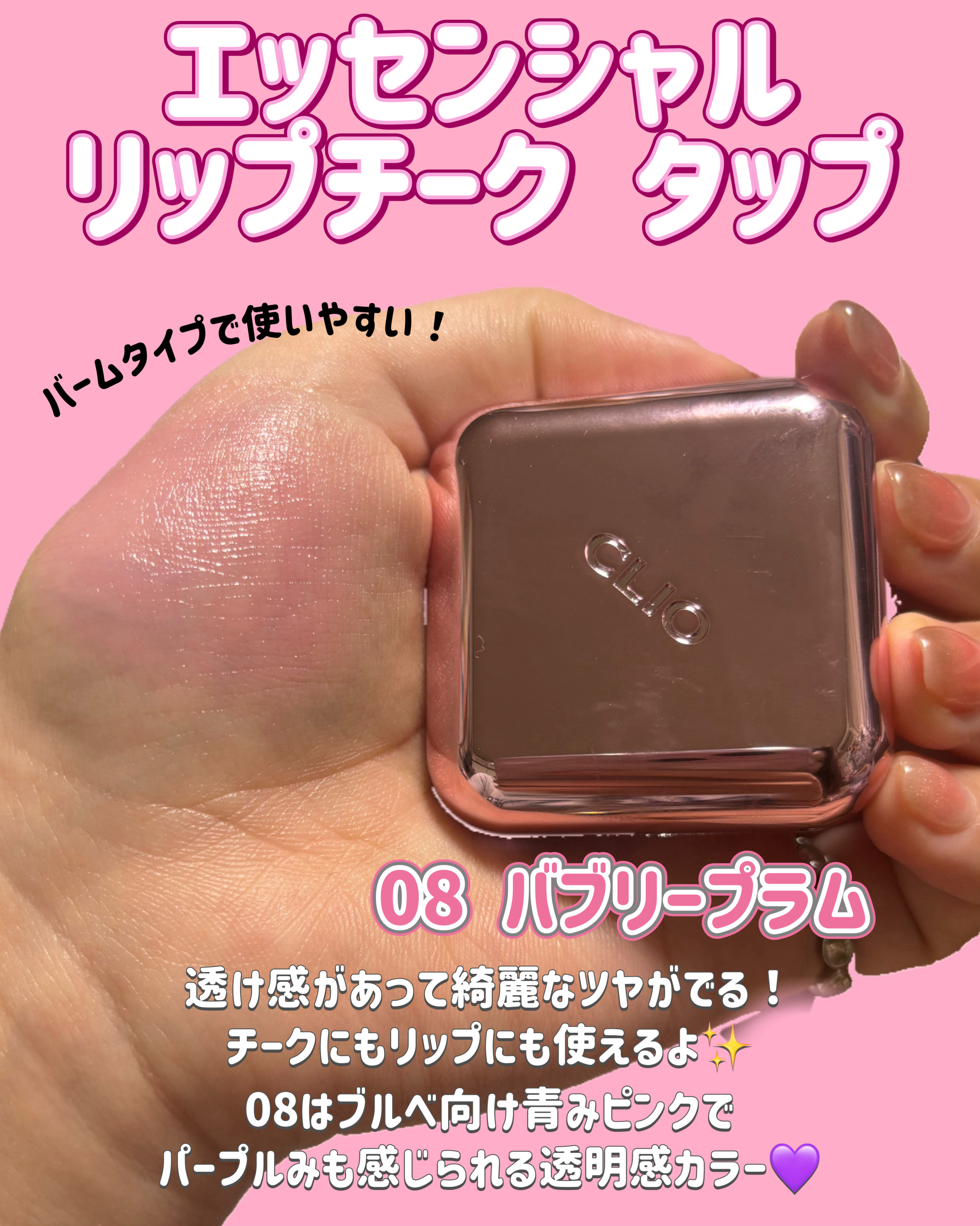 クリオさまからいただきました🫧「エッセンシャルリップチークタップ08バブリープラム」唇にも頬にも使えるマルチコスメ!水まんじゅうみたいにぷるっとした透明感ツヤが出て、ひと塗りで顔色がぱっと華やぐの✨08は特にブルベさんにはたまらない透け感ライ...