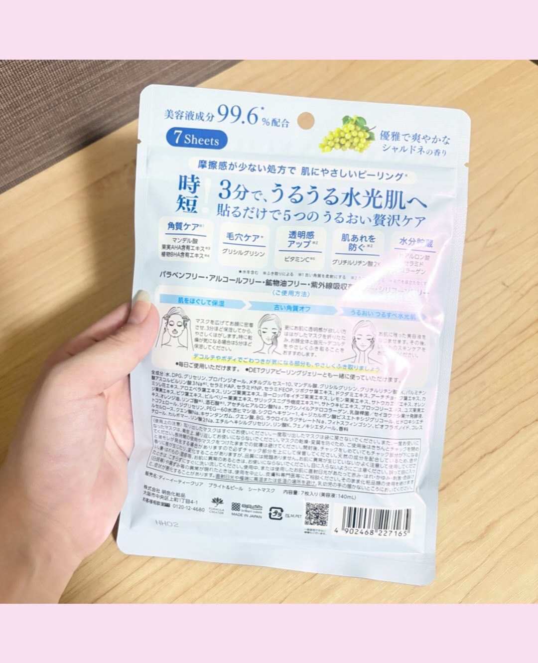 - 美容液成分99.6%配合の贅沢ピーリングマスク。摩擦感が少ない処方で肌にやさしく、角質・毛穴・透明感・肌あれ・水分貯蔵の5つのケアを1枚で完了。忙しい朝晩にも嬉しい3分の時短ケア。優雅で爽やかなシャルドネの香りに包まれながら、肌も心もリフレッシュできるご褒美スキンケアを叶えます。 先行発売日:2025年7月22日(火)