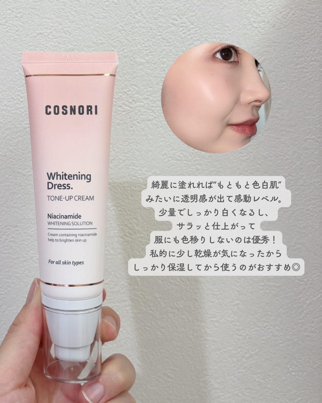COSNORI様よりいただきました✨WHドレストーンアップクリーム全身使えるトーンアップクリームです🤍メイクでトーンアップしたいけど、顔だけ白浮きしてしまうことも🥺そんな時に首やデコルテなどに塗るとメイクと馴染みやすくなり、肌も綺麗に見える💞...