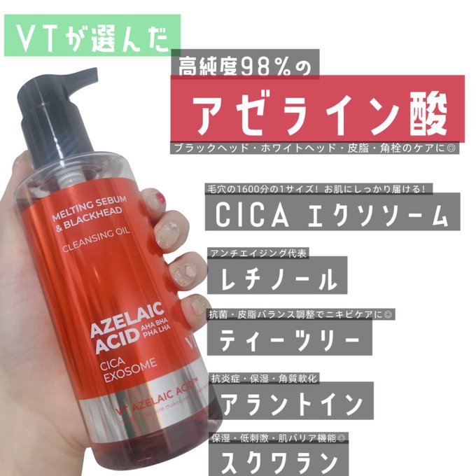 - 最近話題の毛穴ケア・整肌成分アゼライン酸!VTからはクレンジングオイルが登場! ポイントメイクまで落とすしっかりした洗浄力で、毛穴・皮脂までケアし保湿まで叶える一石三鳥アゼライン酸クレンジングオイル。 19種の植物性オイル*1も配合で、目に見えるブラッドヘッド*2から、隠れているホワイトヘッド*2、皮脂まですっきりケアします! ダブル洗顔不要! ※パッケージリニューアル ■このような方へおすすめ メイク・毛穴までディープクレンジング求める方 クレンジングでスキンケアまで行いたい方 ツッパリ感の少ないクレンジングを探していた方 ブラックヘッド*ケアも行いたい方 *1ダイズ油、アルガニアスピノサ核油、ユズ果実油、コメヌカ油、オタネニンジン種子油、アーモンド油、ザクロ種子油、リンゴ種子油、ホホバ種子油、ツバキ種子油、、バオバブ種子油、ユチャ種子油、ベニバナ種子油、ヒマワリ種子油、ヒポファエラムノイデス油、オリーブ果実油、アボカド油、アンズ核油、クロフサスグリ種子油(いずれも保湿) *2古い角質による