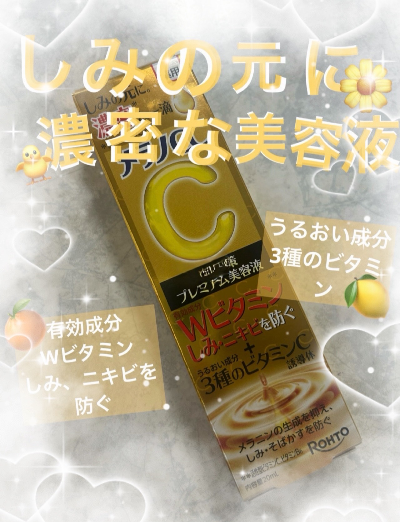 - 【医薬部外品】 これ以上シミ*1を増やしたくない人にオススメしたい薬用美白美容液。 トロッと濃密なテクスチャーの一滴が肌に密着。美白有効成分 活性型ビタミンC*2に加え、うるおい成分として3種のビタミンC誘導体*3も配合しました。ロート製薬独自の浸透処方で、集中的に角層すみずみまで浸透。気になるシミの元まで届き、メラニンの生成を抑え、しみ・そばかすを防ぎます。また、有効成分として皮脂抑制成分:ピリドキシン塩酸塩、殺菌成分:イソプロピルメチルフェノール、抗炎症成分:アラントインも配合し、気になるニキビもしっかり予防します。 洗顔後に化粧水等でお肌を整えた後、適量を手のひらにとり、気になる部分または顔全体になじませて使用します。 *1:日焼けによる *2:アスコルビン酸 *3:L-アスコルビン酸2-グルコシド(アスコルビルグルコシド)、3-O-エチルアスコルビン酸、ビタミンCテトライソパルミテート