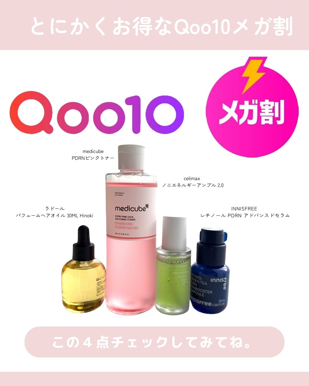 \私Qoo10アンバサダーがガチ愛用。メガ割おすすめ4選/テクスチャー動画も一緒に載せてます♡LADORパフュームヘアオイル30MLHinokimedicubePDRNピンクトナーcelimaxノニエネルギーアンプル2.0INNISFREEレ...