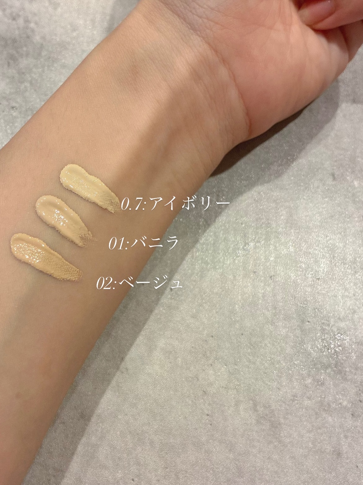 - <0.5 ポーセリン> 水、シクロペンタシロキサン、フェニルトリメチコン、タルク、セチルPEG/PPG-10/1ジメチコン、BG、PVP、ナイアシンアミド、(ビニルジメチコン/メチコンシルセスキオキサン)クロスポリマー、PEG-10ジメチコン、塩化Na、ジステアルジモニウムヘクトライト、トリエトキシカプリリルシラン、水酸化Al、p-アニス酸、カプリル酸グリセリル、パルミチン酸、ジメチコン、ステアリン酸、アデノシン、ツボクサエキス、スベリヒユエキス、カミツレ花エキス、セイヨウニンジンボク果実エキス、ヒポファエラムノイデス果実エキス、香料、酸化チタン、酸化鉄 <0.7 アイボリー> 水、シクロペンタシロキサン、フェニルトリメチコン、タルク、セチルPEG/PPG-10/1ジメチコン、BG、PVP、ナイアシンアミド、(ビニルジメチコン/メチコンシルセスキオキサン)クロスポリマー、PEG-10ジメチコン、塩化Na、ジステアルジモニウムヘクトライト、トリエトキシカプリリルシラン、水酸化Al、p-アニス酸、カプリル酸グリセリル、パルミチン酸、ジメチコン、ステアリン酸、アデノシン、ツボクサエキス、スベリヒユエキス、カミツレ花エキス、セイヨウニンジンボク果実エキス、ヒポファエラムノイデス果実エキス、香料、酸化チタン、酸化鉄 <01 バニラ> 水、シクロペンタシロキサン、フェニルトリメチコン、タルク、セチルPEG/PPG-10/1ジメチコン、BG、PVP、ナイアシンアミド、(ビニルジメチコン/メチコンシルセスキオキサン)クロスポリマー、PEG-10ジメチコン、塩化Na、ジステアルジモニウムヘクトライト、トリエトキシカプリリルシラン、水酸化Al、p-アニス酸、カプリル酸グリセリル、パルミチン酸、ステアリン酸、ジメチコン、アデノシン、ツボクサエキス、スベリヒユエキス、カミツレ花エキス、セイヨウニンジンボク果実エキス、ヒポファエラムノイデス果実エキス、香料、酸化チタン、酸化鉄 <02 ベージュ> 水、シクロペンタシロキサン、フェニルトリメチコン、タルク、セチルPEG/PPG-10/1ジメチコン、BG、PVP、ナイアシンアミド、(ビニルジメチコン/メチコンシルセスキオキサン)クロスポリマー、PEG-10ジメチコン、塩化Na、ジステアルジモニウムヘクトライト、トリエトキシカプリリルシラン、水酸化Al、p-アニス酸、カプリル酸グリセリル、パルミチン酸、ステアリン酸、ジメチコン、アデノシン、ツボクサエキス、スベリヒユエキス、カミツレ花エキス、セイヨウニンジンボク果実エキス、ヒポファエラムノイデス果実エキス、香料、酸化チタン、酸化鉄 <03 ブライト> 水、シクロペンタシロキサン、酸化チタン、炭酸ジエチルヘキシル、BG、ネオペンタン酸イソデシル、PEG-10ジメチコン、グリセリン、安息香酸アルキル(C12-15)、(VP/ヘキサデセン)コポリマー、ナイアシンアミド、クオタニウム-18ベントナイト、セスキオレイン酸ソルビタン、塩化Na、ミツロウ、シリカ、(ジメチコン/ビニルジメチコン)クロスポリマー、トリエトキシカプリリルシラン、水酸化Al、1,2-ヘキサンジオール、カプリリルグリコール、酢酸トコフェロール、アデノシン、ジメチコン、ツボクサエキス、スベリヒユエキス、カミツレ花エキス、セイヨウニンジンボク果実エキス、ヒポファエラムノイデス果実エキス、酸化鉄、グンジョウ
