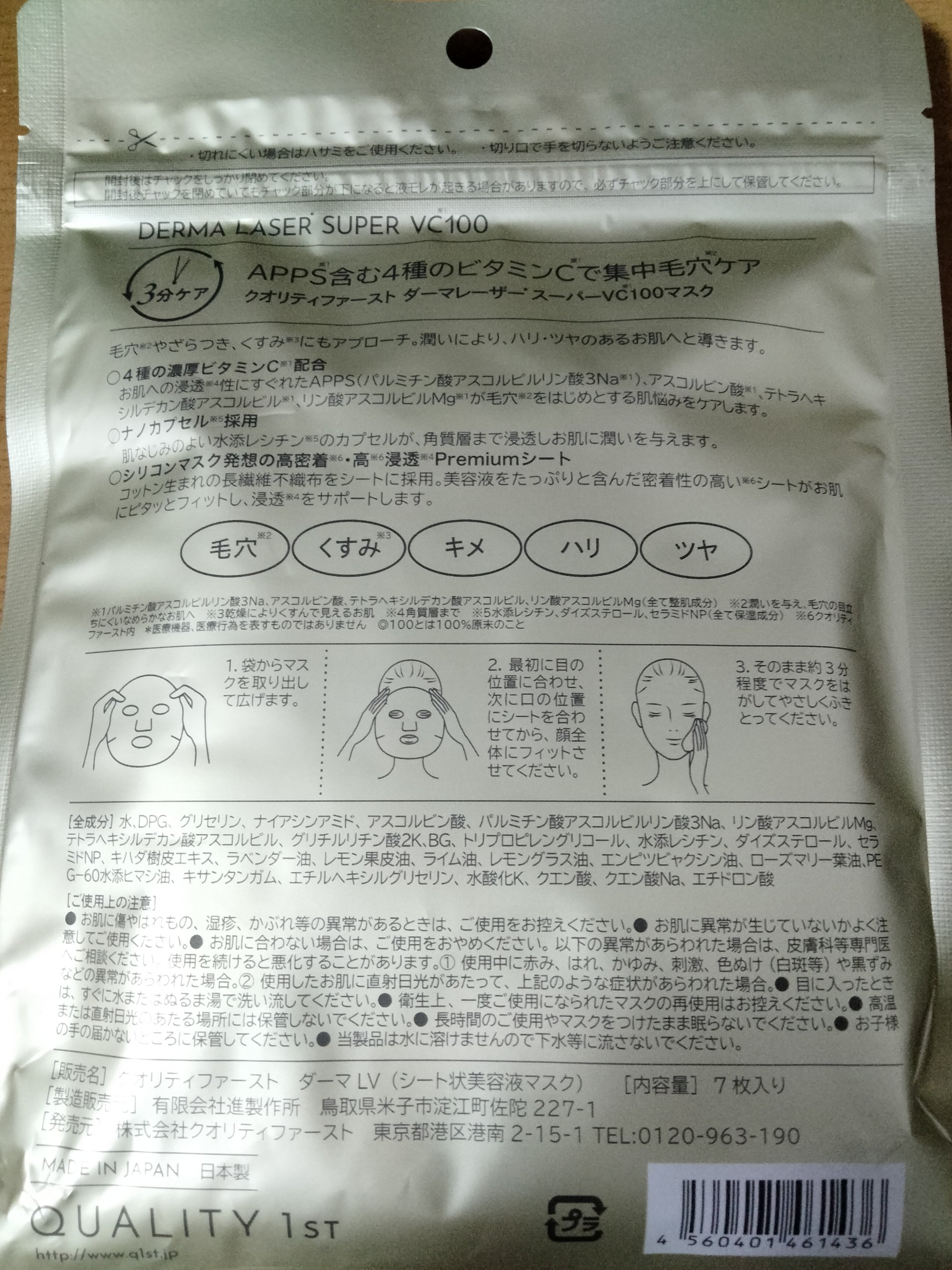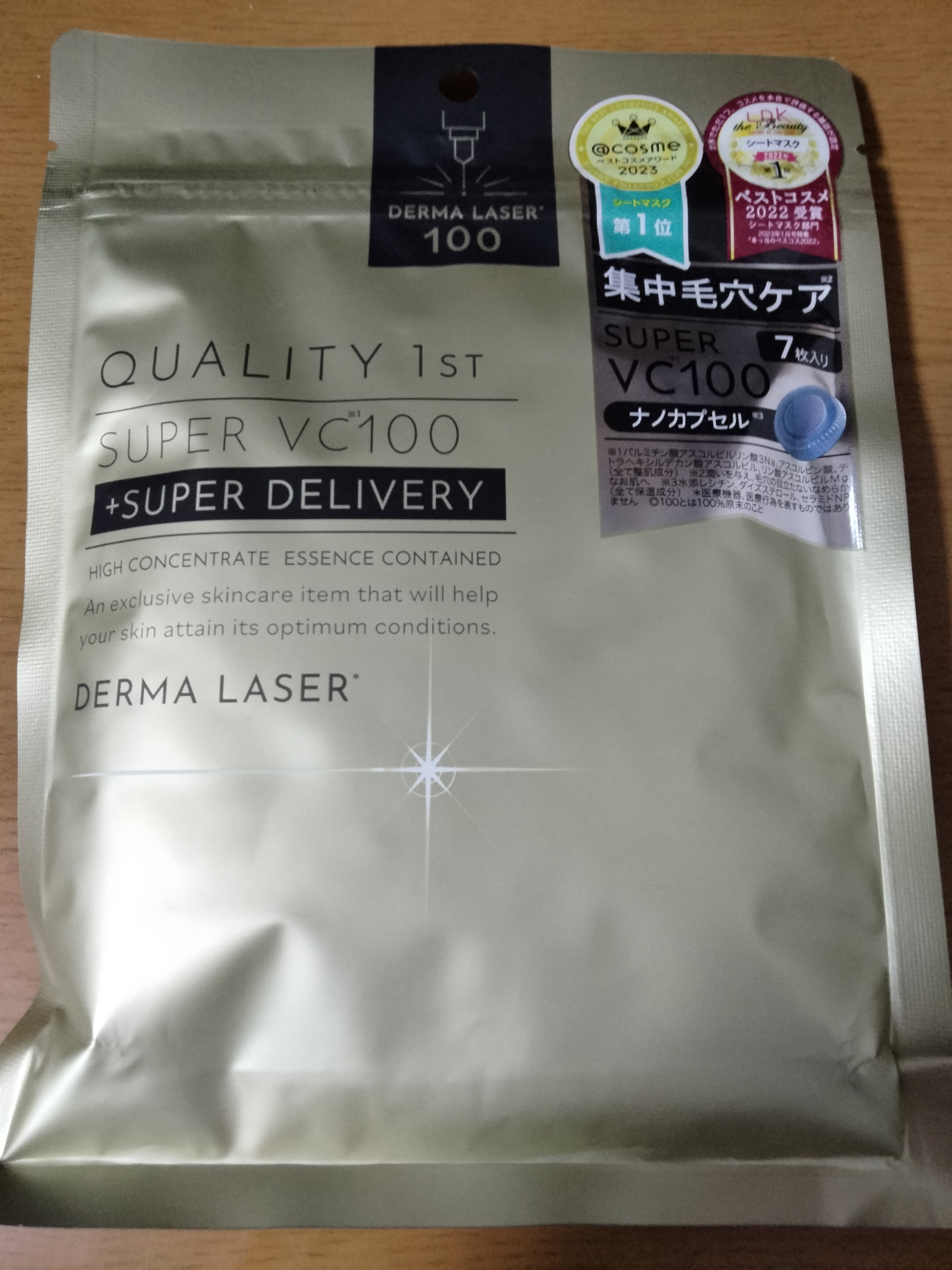 quality1stダーマレーザースーパーVC100集中毛穴ケア肌にピッタリ密着して気持ちいいマスクです❗美容液がたっぷりなのでタレないように注意です。ペタつくので、夜だけ使用しております。15分くらいパックすると翌朝は化粧のりが良かったです...