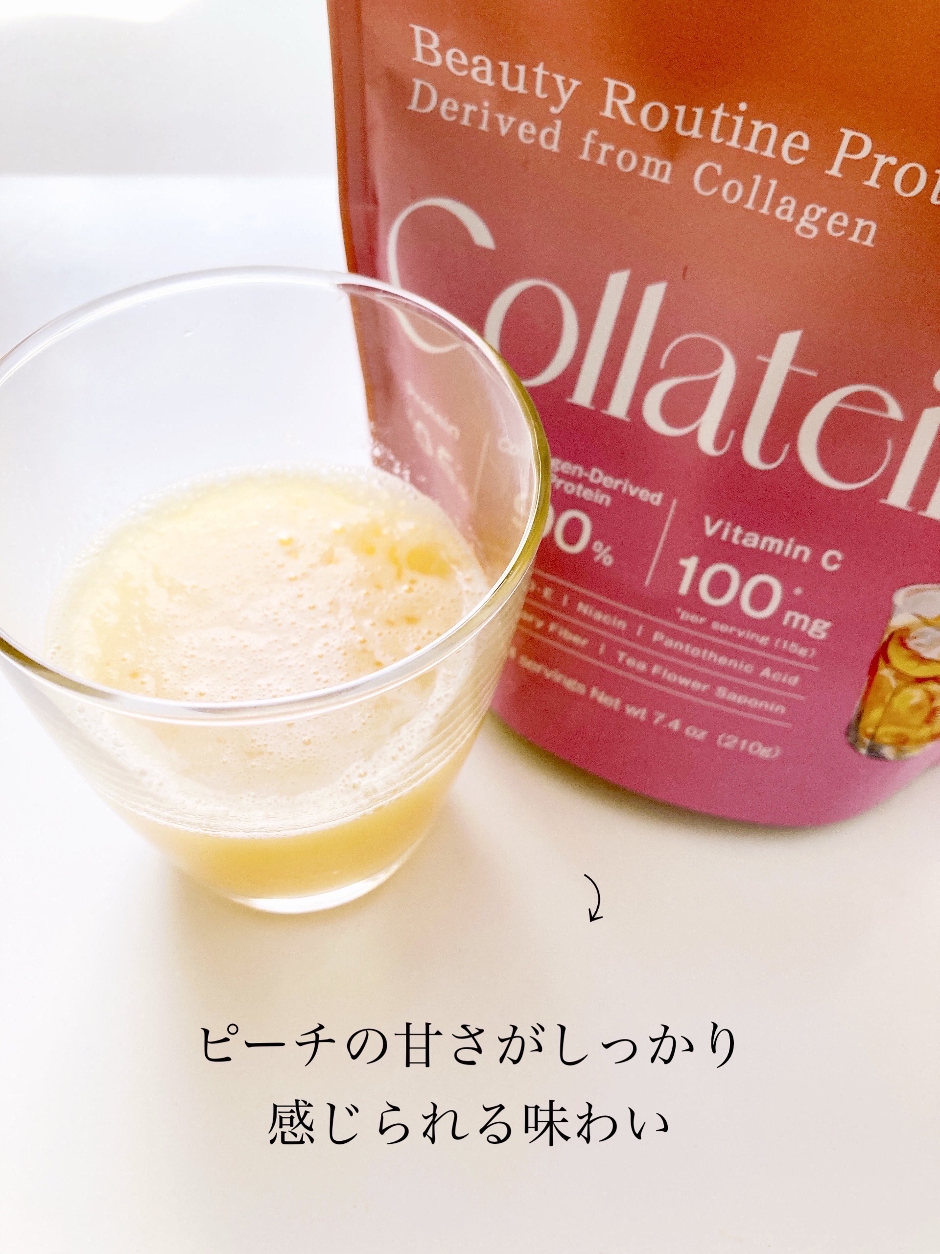 - 1回分でタンパク質10.5g摂取 そのうち90%がコラーゲン由来 12種の栄養機能食品&9種のミネラル&3種の美容成分を配合 さらに人口着色料・保存料フリーな安心設計 1杯あたり53.70kcal コラーゲンベースのプロテインのため、サッと溶けてフルーツ系のサッパリとした味わいを楽しめる