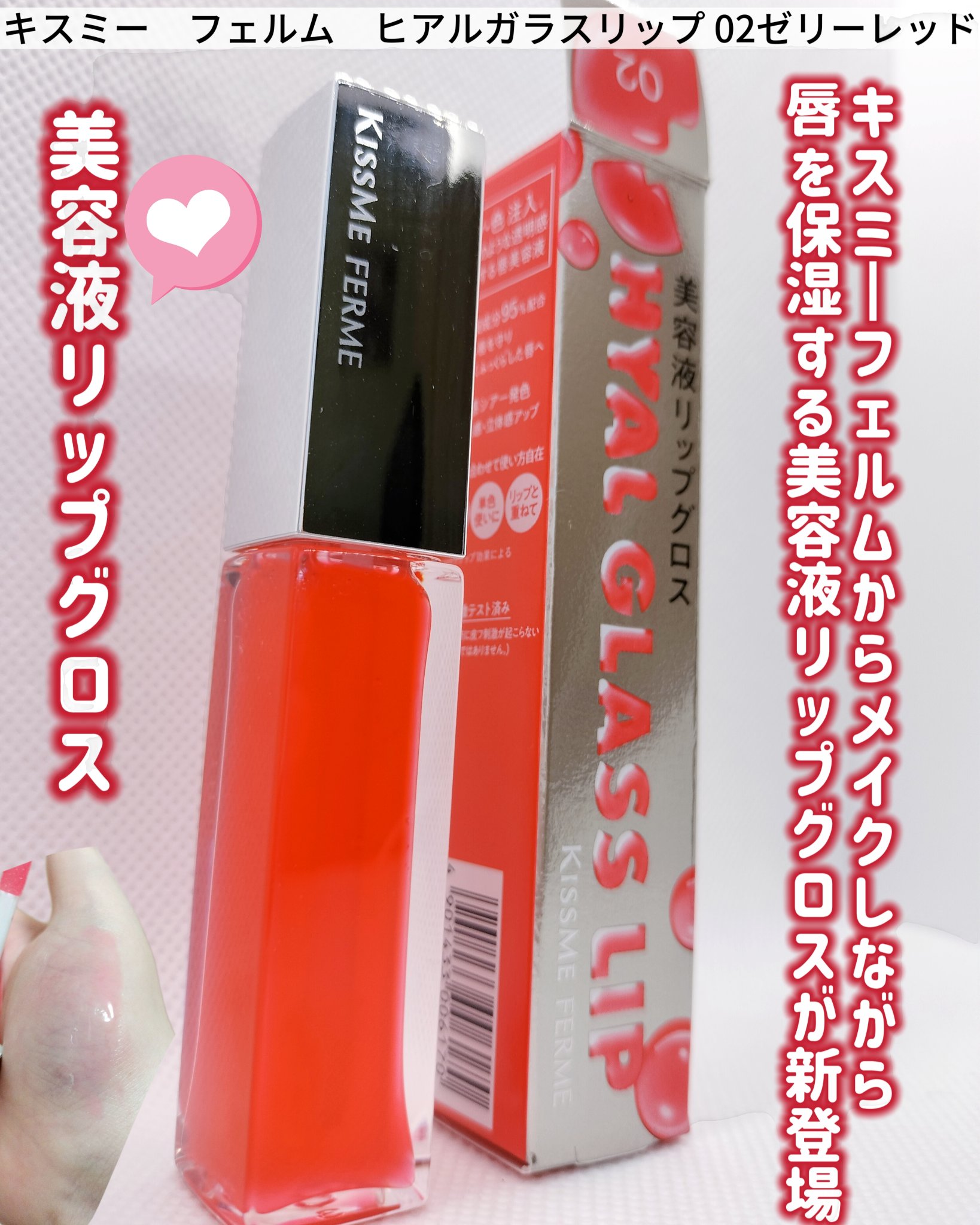 キスミーフェルムさまからいただきましたキスミーフェルム ヒアルガラスリップ02ゼリーレッドをお試しさせていただきました。ガラスのような透明感のあるリップ。しっとり粘度のあるテクスチャーです。ぴたっと唇になじみ、密着してくれます。ほんのり色づい...