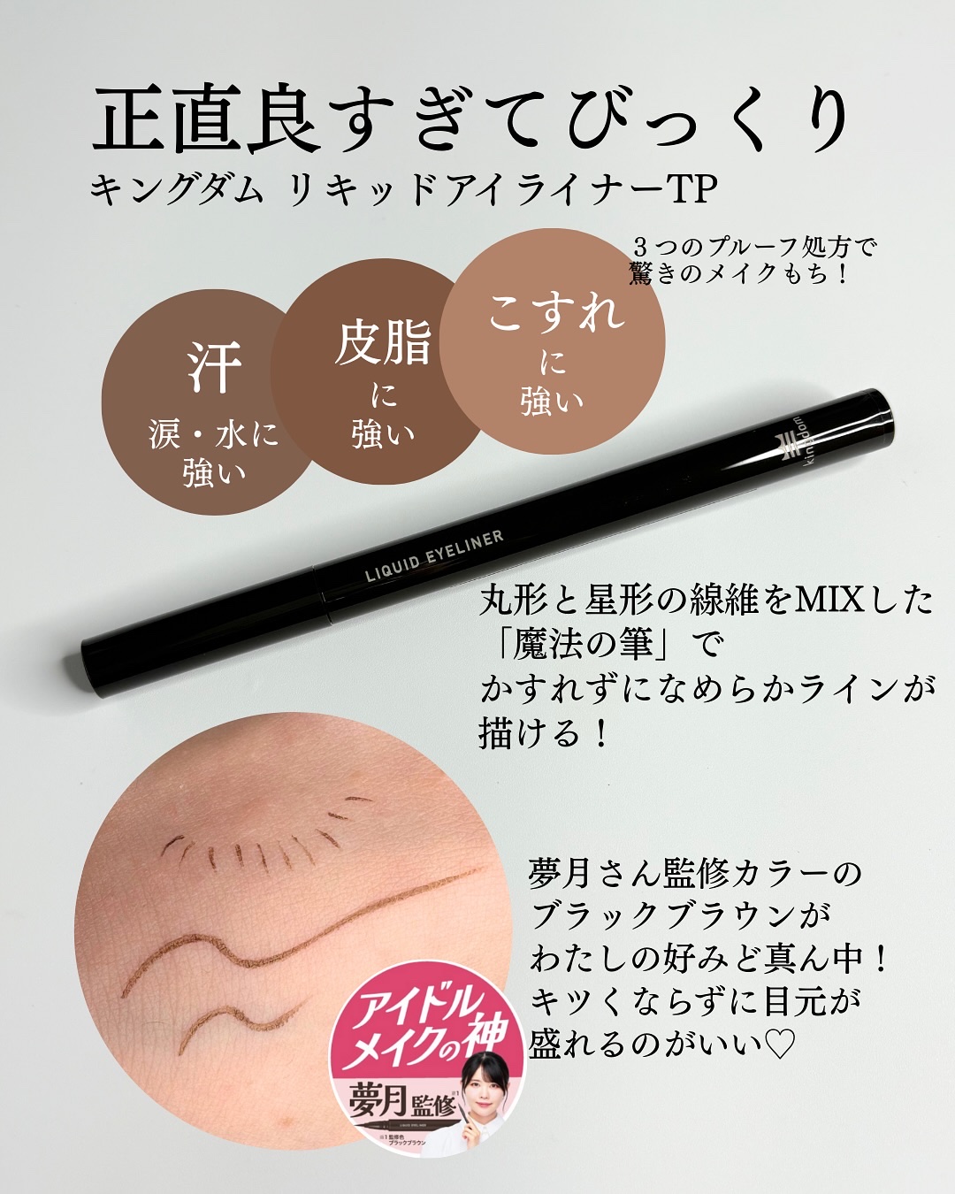 - キングダム リキッドアイライナーTPは、初心者でも、簡単に理想のアイラインが引ける「魔法の筆」を採用。ブレにくく描ける安定感とかすれにくく描けることが特長で、日常使いからステージメイクまで幅広く対応します。 さらに、落ちにくさも強化*。「こすれプルーフ」を含む3つのプルーフ処方へと進化*しました。 Point 1:誰でもプロ級!ブレにくい × かすれにくい「魔法の筆」 「ブレにくく描ける」丸形センイと、「かすれにくく描ける」星形センイをブレンドし、0.1mmの極細ラインもなめらかに描けます。 ●【丸形センイ:ブレにくい】太さの異なるセンイを絶妙なバランスで配合。手ブレしにくい、コシのある筆を実現! ●【星形センイ:かすれにくい】凹み部分に液をたっぷり含むことができるため、かすれにくい! Point 2:涙・皮脂・こすれに強い!3つのプルーフ処方 ①涙・水・汗に強い:ウォータープルーフ ②皮脂に強い:スマッジプルーフ ③こすれに強い:こすれプルーフ <ブラウン> 自然な目力 王道ブラウン。 <ブラック> 強すぎない絶妙ブラック。 <ブラックブラウン> 黒の目力×茶の柔らかさを兼ねそろえた黒みブラウン。 <ラテブラウン> 柔らか盛れ まろみラテブラウン。 *自社従来品との比較
