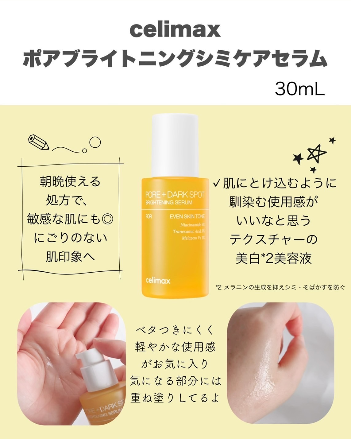 肌に潤いを与え、シミ・そばかすを防いでくもりのない肌へ導く美容液 いちごシロップみたいな見た目が好き、ビタミン12由来の色なんだそう とろみがあるけどメイク前にも使えるのがいいなと思うベタつきにくいテクスチャー
