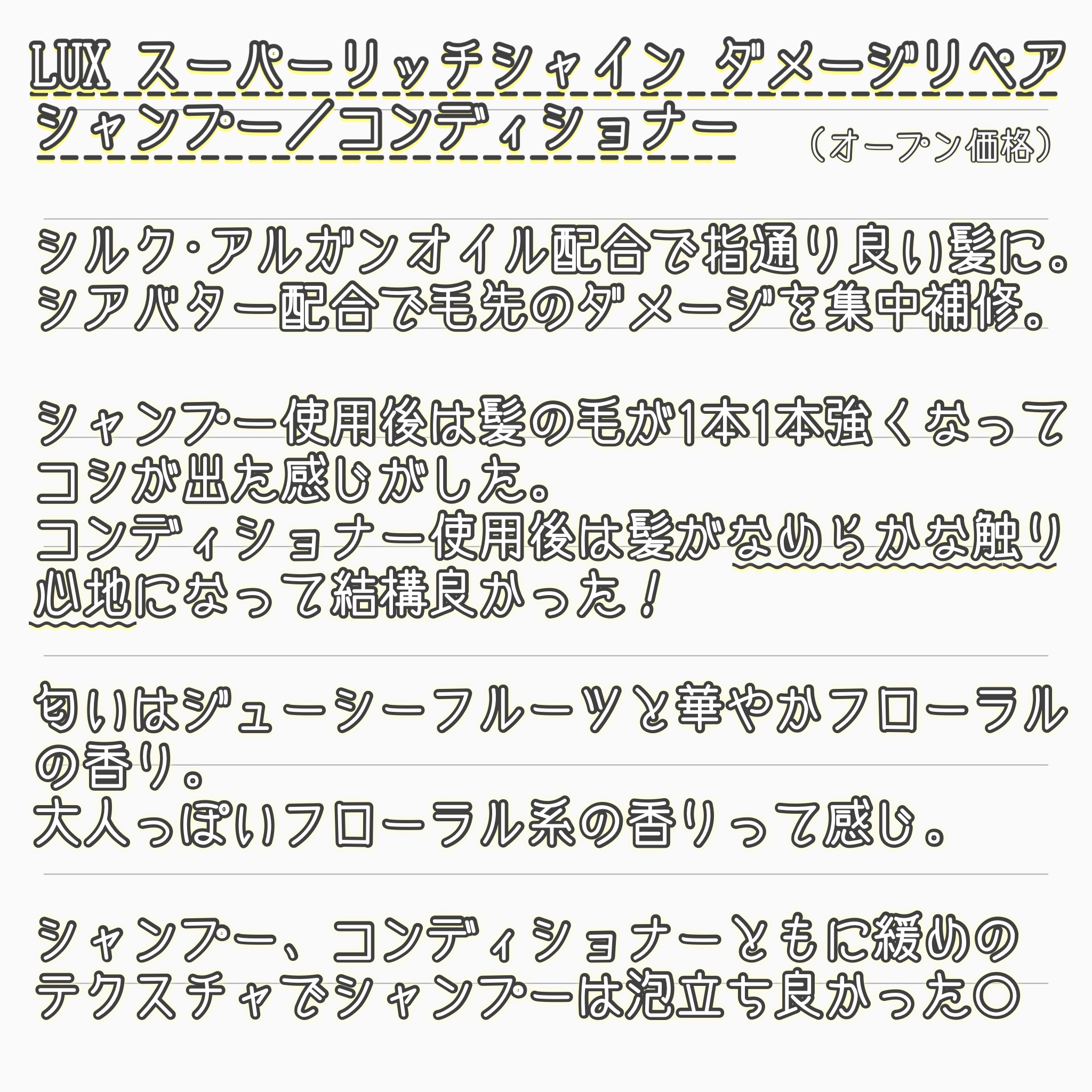 LIPSを通し、LUXより「スーパーリッチシャインダメージリペア補修シャンプー/補修コンディショナー」と「スーパーリッチシャインダメージリペア補修ヘアオイル」を頂きました。LUXスーパーリッチシャインが10年ぶりに大幅リニューアルとなりました...