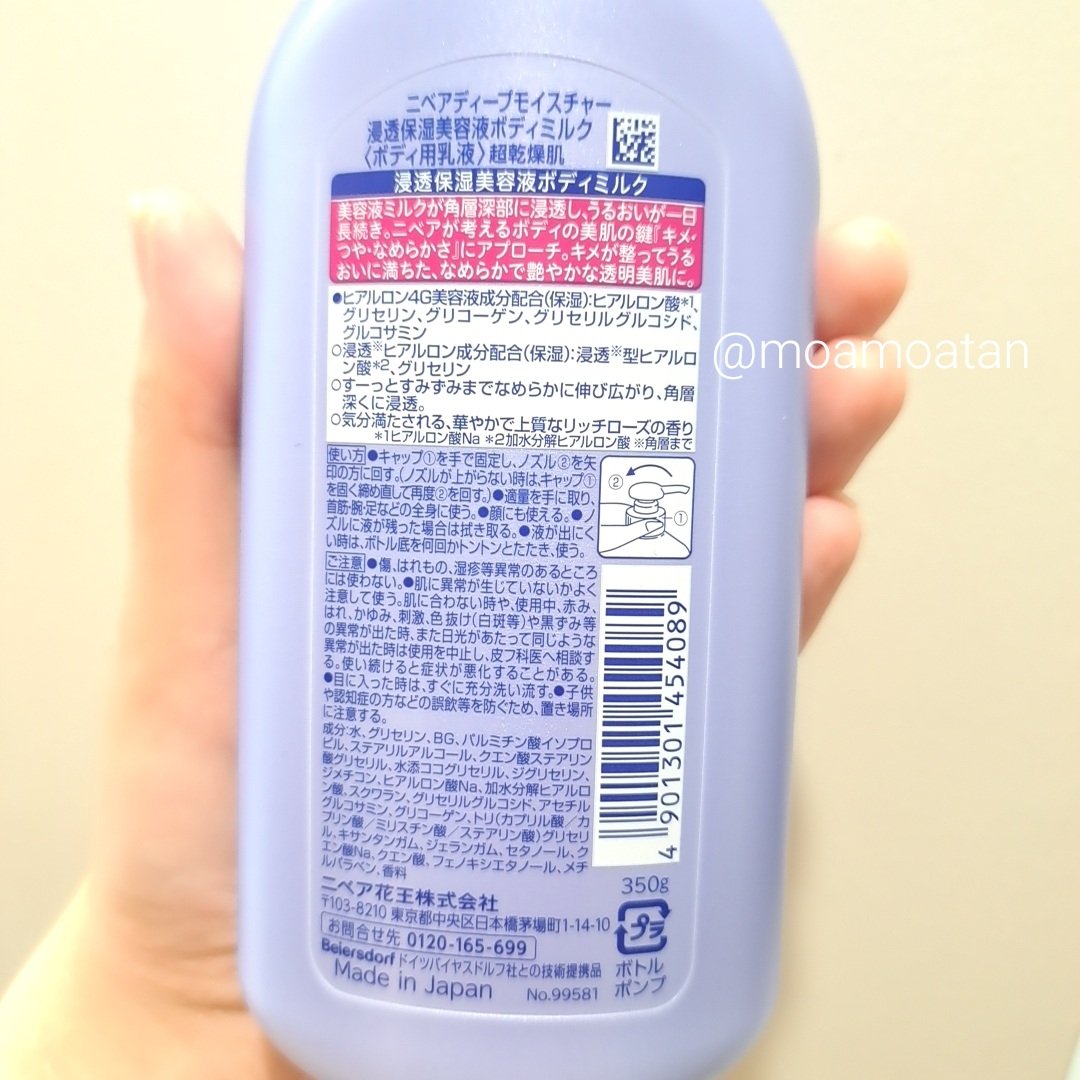 - うるおって透明感あふれる美肌へ導く、高保湿美容液ボディミルクシリーズ。 ニベアが考えるボディの美肌の鍵「キメ・つや・なめらかさ」にアプローチ。 うるおいに満ちて透明感のある肌に導く。ヒアルロン4G美容液成分※1 配合(保湿) キメが整ってなめらかで艶やかなうるおい透明美肌に。美容液ミルクが角層深部に浸透し、うるおいが長続き。 浸透ヒアルロン成分配合:浸透型※2ヒアルロン酸※3、グリセリン(すべて保湿) 気分満たされる、華やかで上質なリッチローズの香り ※1 ヒアルロン酸Na、グリセリン、グリコーゲン、グリセリルグルコシド、グルコサミン ※2 角層まで ※3 加水分解ヒアルロン酸