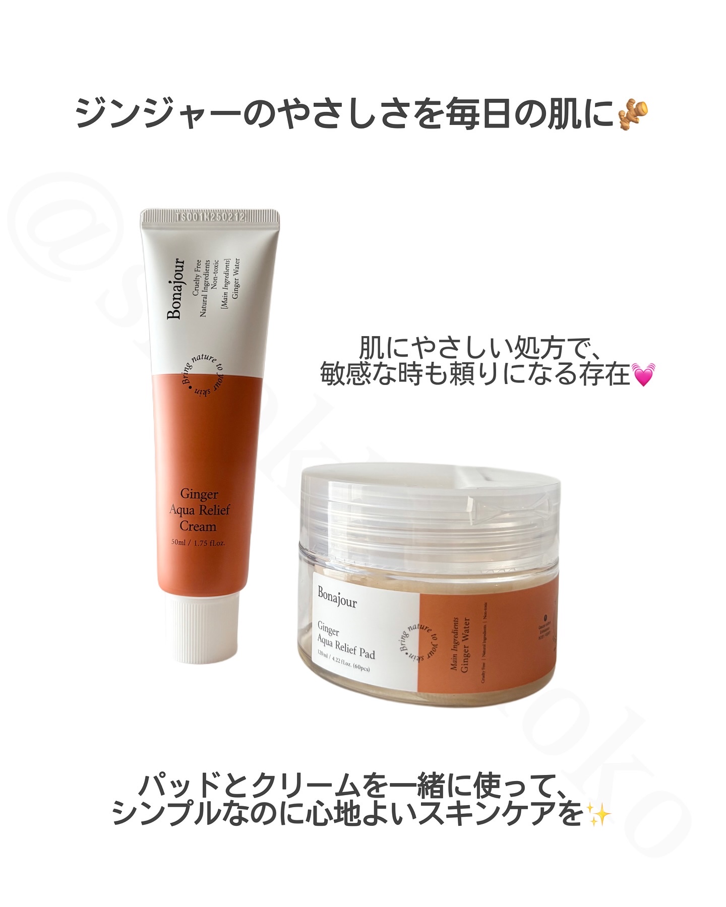 \ジンジャーのうるおいで、肌をやさしくレスキュー🍃✨/敏感になりやすい季節のゆらぎ肌にぴったりな【BONAJOUR】のジンジャーアクアリリーフシリーズ💛◻️ジンジャーアクアリリーフパッドひんやり心地いいシートで肌をなめらかに整え、必要なうるお...