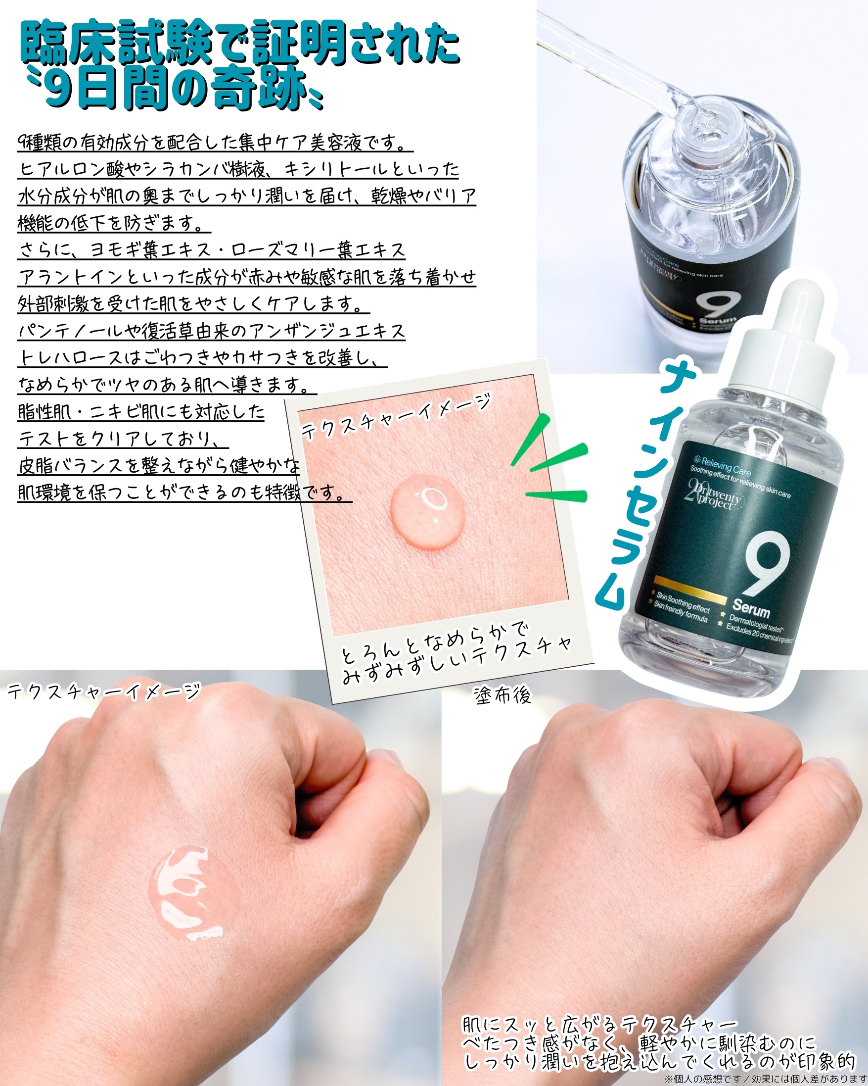 Dr.TwentyProjectナインセラム✨日常の生活により刺激を受けた敏感肌に🍀肌荒れ予防・肌バリアサポート・水分ケアのバランスで肌環境を整えて健やかな状態に導いてくれるそう💡"9つのACTIVE*核心成分×9日間の集中ケア"がネーミング...