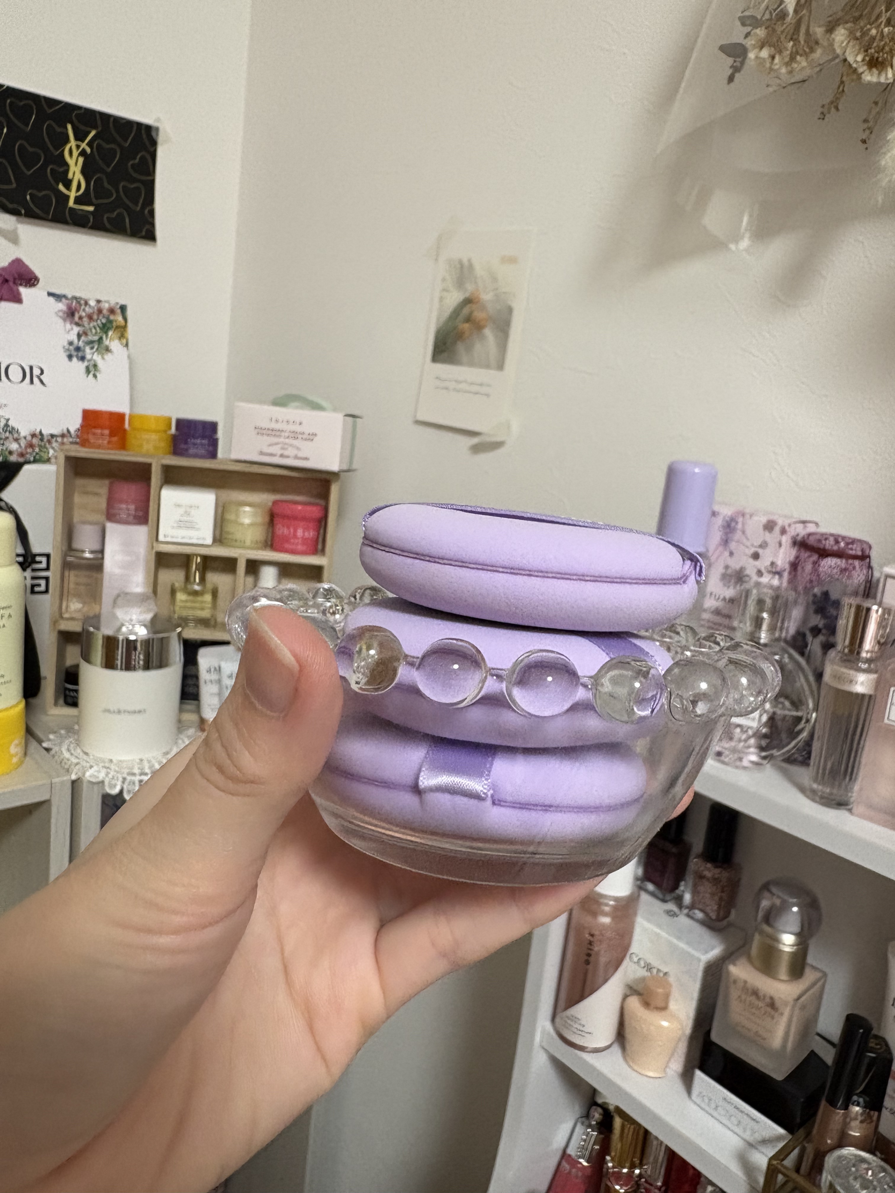毎日使う場所なので1番気分が上がる空間にしたく、見せる収納にしています🎀 ミラーにタッチ式の3段階ライトつき! 見た目がかわいいお気に入りコスメは、引き出しに入れずに飾っています💛
