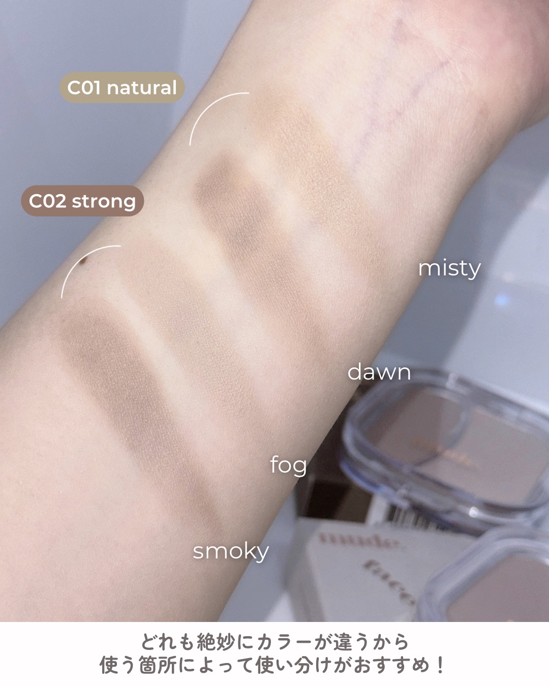 どんな肌トーンにも♡mude.ミュードフェイススカルプターシェーディングC01ナチュラル/C02ストロング柔らかくムラなく広がり、誰でも簡単にシェーディング!✦C01ナチュラルミスティmisty中間明るさのニュートラルベージュドーンdawn黄...