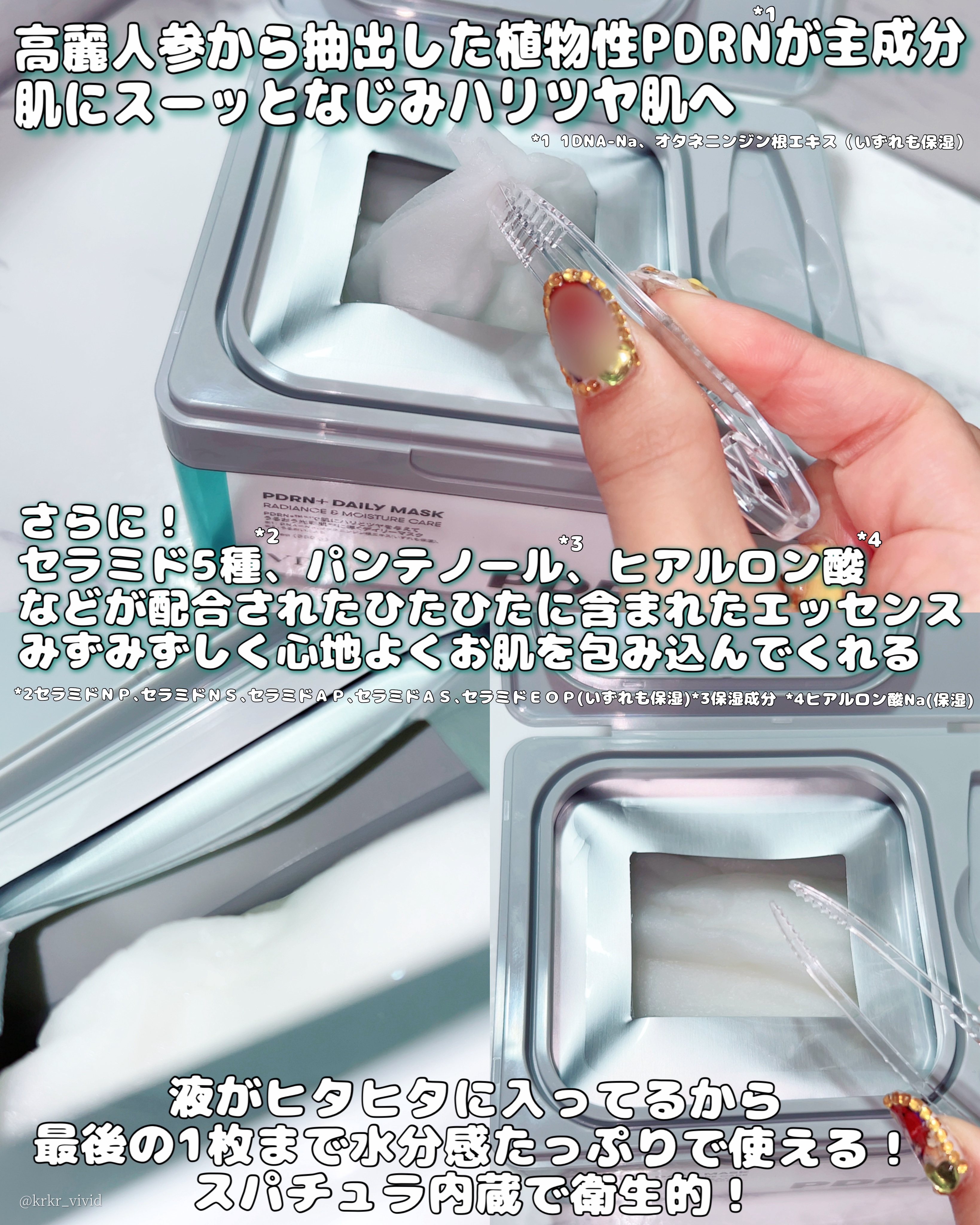 - 韓国で話題の植物性PDRN+™* 1日1PDRN+デイリーマスクで、ツヤのある健康な肌へ! ※DNA-Na、オタネニンジン根エキス(いずれも保湿) 「昨日の肌よりいい感じ。」をつくるPDRN+デイリーマスク 美肌力に欠かせない美容成分をたっぷり*含んだ高麗人参由来のPDRN+™*を配合 外部刺激によりゆらぎやすくなった肌にハリ&ツヤを与え、もちもちしたハリ&すこやかなツヤ感のある肌へ導きます