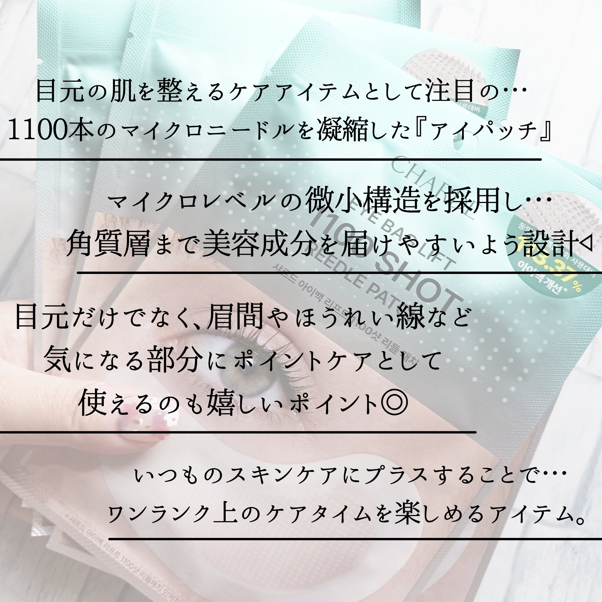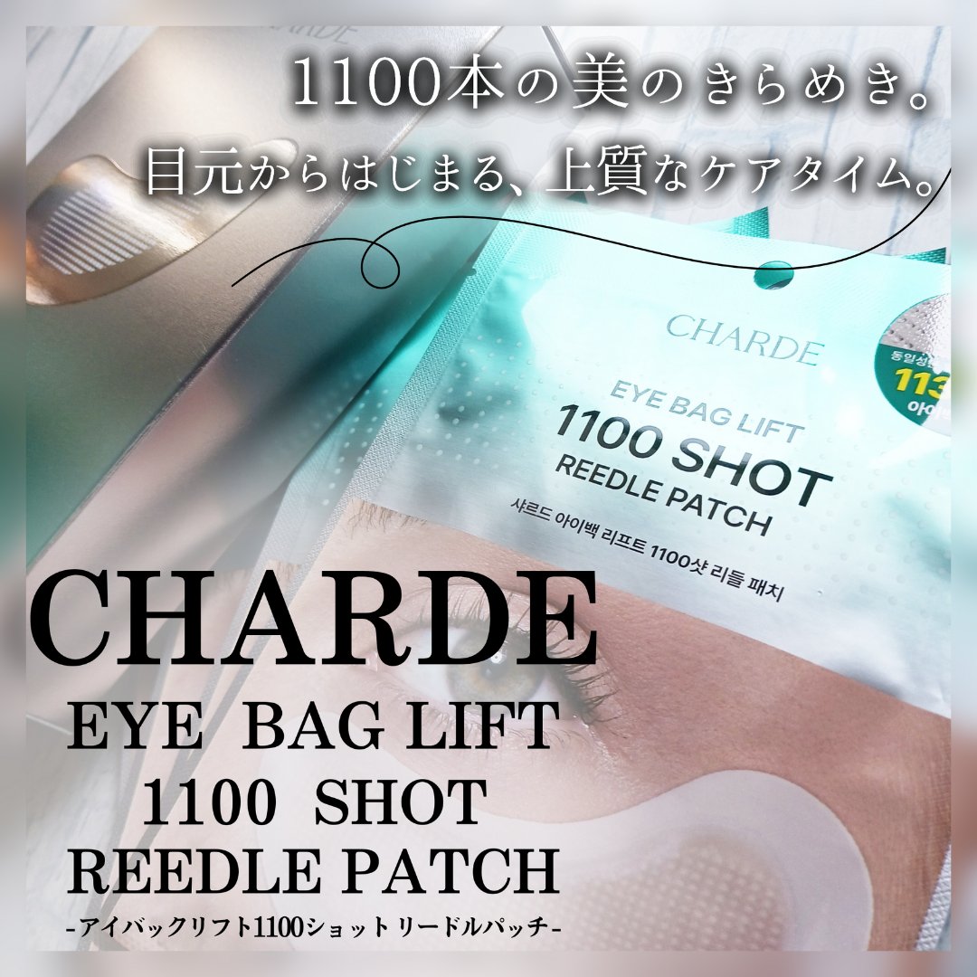 CHARDE(シャルド)アイバックリフト1100シャットリードルパッチインパクトあるパッケージ。アンプルを1100本のマイクロニードルに凝縮していて、アンプル10本分塗布と同様の効果が得られるそう!⭐︎使い方⭐︎洗顔・化粧水などで肌を整えた後...