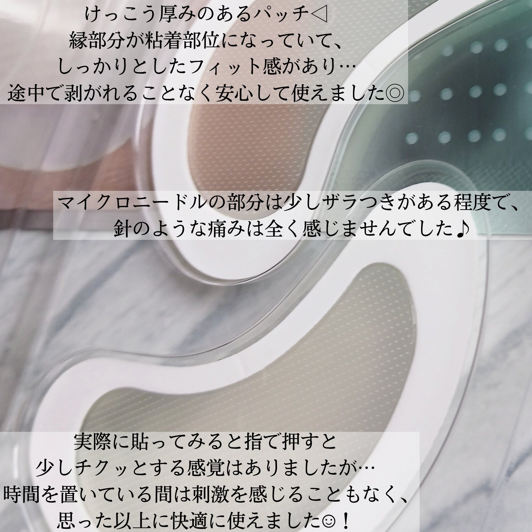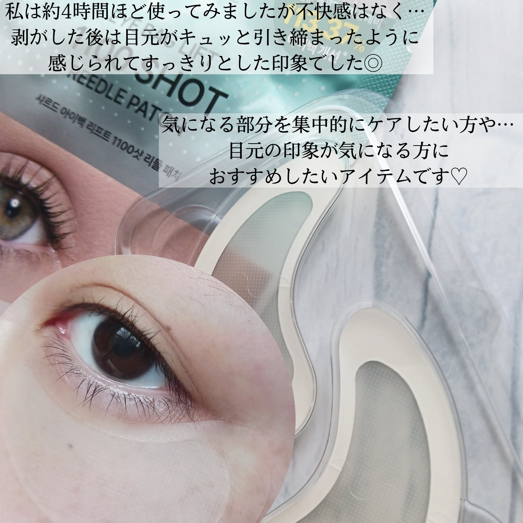 - 気になる目元の肌にハリを与える 肌にすっとなじむ美容保湿成分配合 パッチ1回で1,100回のニードルショット*1 長く貼ってもやさしい使い心地!(韓国内にて低刺激テスト完了*2) 目元だけでなく集中ケアが必要な部位にもお使いいただけます。 *1角質層まで *2全ての方に皮膚刺激が発生しないということではありません