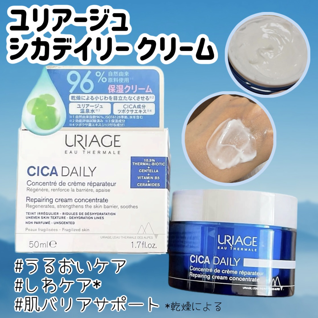 - (1) 肌のバリア機能をサポート ユリアージュ温泉水とイヌリンの複合美容成分「サーマルバイオティックコンプレックス」*2が、肌のトリプルバリア(うるおいバリア・ナチュラルバリア・美肌菌バリア)をサポート。 [うるおいバリア] 角層水分の蒸散を防ぐ。 ユリアージュ温泉水に含まれるミネラルと、角層でNMFのもととなるフィラグリン、細胞同士を接着するタイトジャンクションに存在するクローディン4に着目。 [ナチュラルバリア]肌本来の「守る力」をサポート。 ユリアージュ温泉水に含まれるミネラルと、自然免疫細胞の表面に存在する糖たんぱく質 「ランジェリン」に着目。 [美肌菌バリア] チコリとアガベから抽出された天然原料であるイヌリンを配合。美肌菌(マイクロバイオーム・皮膚の細菌叢)をうるおいでサポートしながら、肌を整える。 (2) 乾燥対応の美容成分を配合。乾燥小じわを目立たなくする。 CICA成分、セラミド類似物質、ビタミンB5、ヒアルロン酸配合。 ・ CICA成分:ツボクサ葉エキス(ハリ付与成分) ・ セラミド類似物質:(サフラワー油/パーム油)アミノプロパンジオールエステルズ(整肌成分) ・ ビタミンB5:パンテノール(整肌成分) ・ ヒアルロン酸:ヒアルロン酸Na(保湿成分) *1 効能評価試験済み *2 イヌリン、ユリアージュ温泉水(保湿成分) *3 ツボクサ葉エキス(ハリ付与成分) *4 (サフラワー油/パーム油)アミノプロパンジオールエステルズ(整肌成分) *5 パンテノール(整肌成分) *6 ヒアルロン酸Na(保湿成分) *7 早いうちから始める年齢に応じたお手入れのこと *8 自然由来指数96%、ISO16128準拠、水を含む