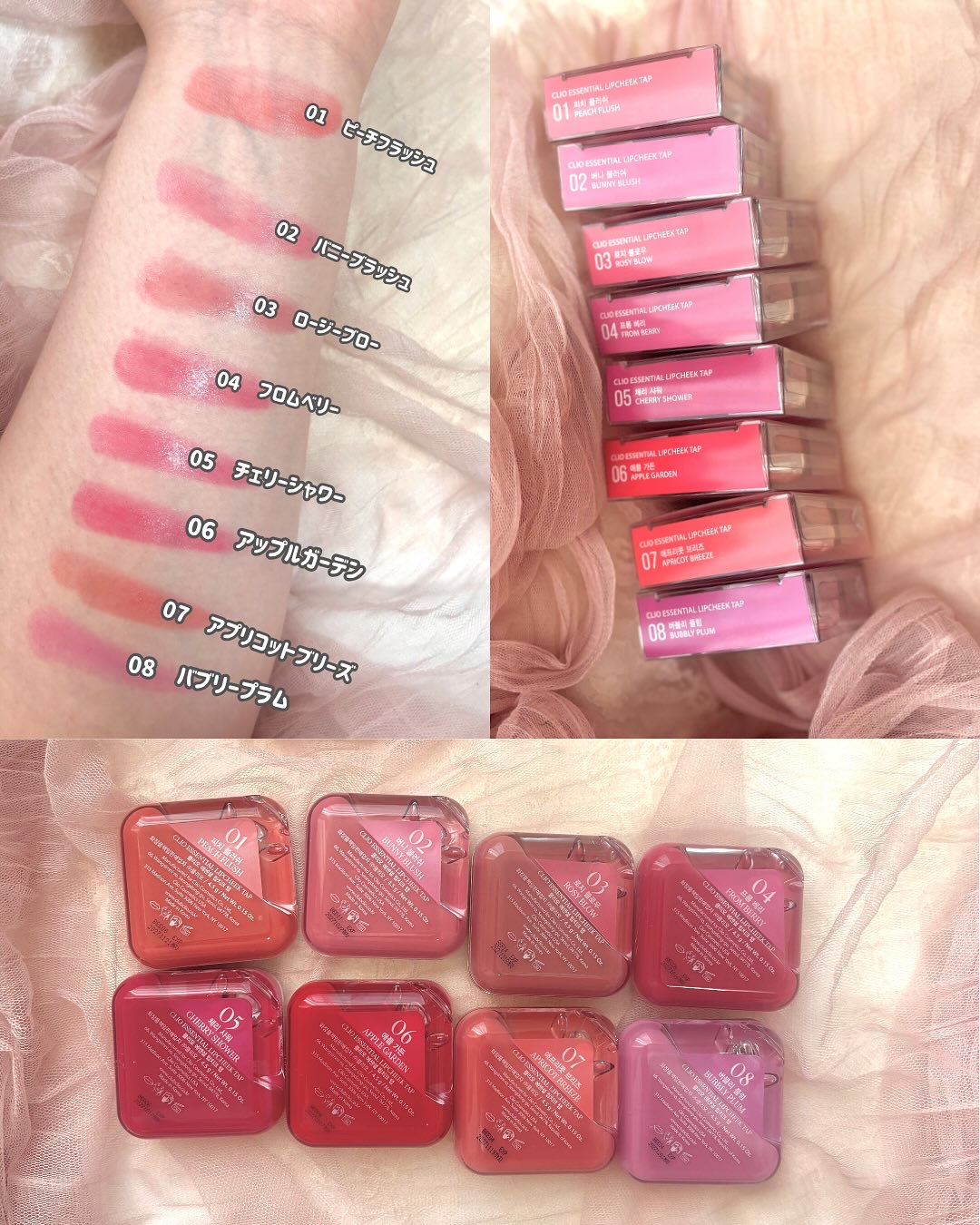 - ヘルシーで華やかな印象を叶える、リップやチークなどマルチに使える透明感のあるカラーのバーム。 <01 ピーチフラッシュ(PEACH FLUSH)> ヘルシーに表現されるピーチ コーラル カラー <02 バニーブラッシュ(BUNNY BLUSH)> 可愛らしく清純なベビーピンク カラー <03 ロージーブロー(ROSY BLOW)> 落ち着きのある成熟したロージーカラー <04 フロムベリー(FROW BERRY)> 紫色を一滴追加、デイリーベリーカラー <05 チェリーシャワー(CHERRY SHOWER)> イキイキとした血色感を与えるチェリー 果汁カラー <06 アップルガーデン(APPLE GARDEN)> クリアに満ちるレッドアップルカラー <07 アプリコット ブリーズ(APRICOT BREEZE)> やわらかい陽ざしのぬくもりを閉じ込めたサンキスドコーラル <08 バブリープラム(BUBLY PLUM)> 活気に満ちたライラックの花のように爽やかなライブリーパープル <100 シュガーリボン(SUGAR RIBBON)> ふんわり甘く、きゅんをひとさじしたようなローズピンクカラー