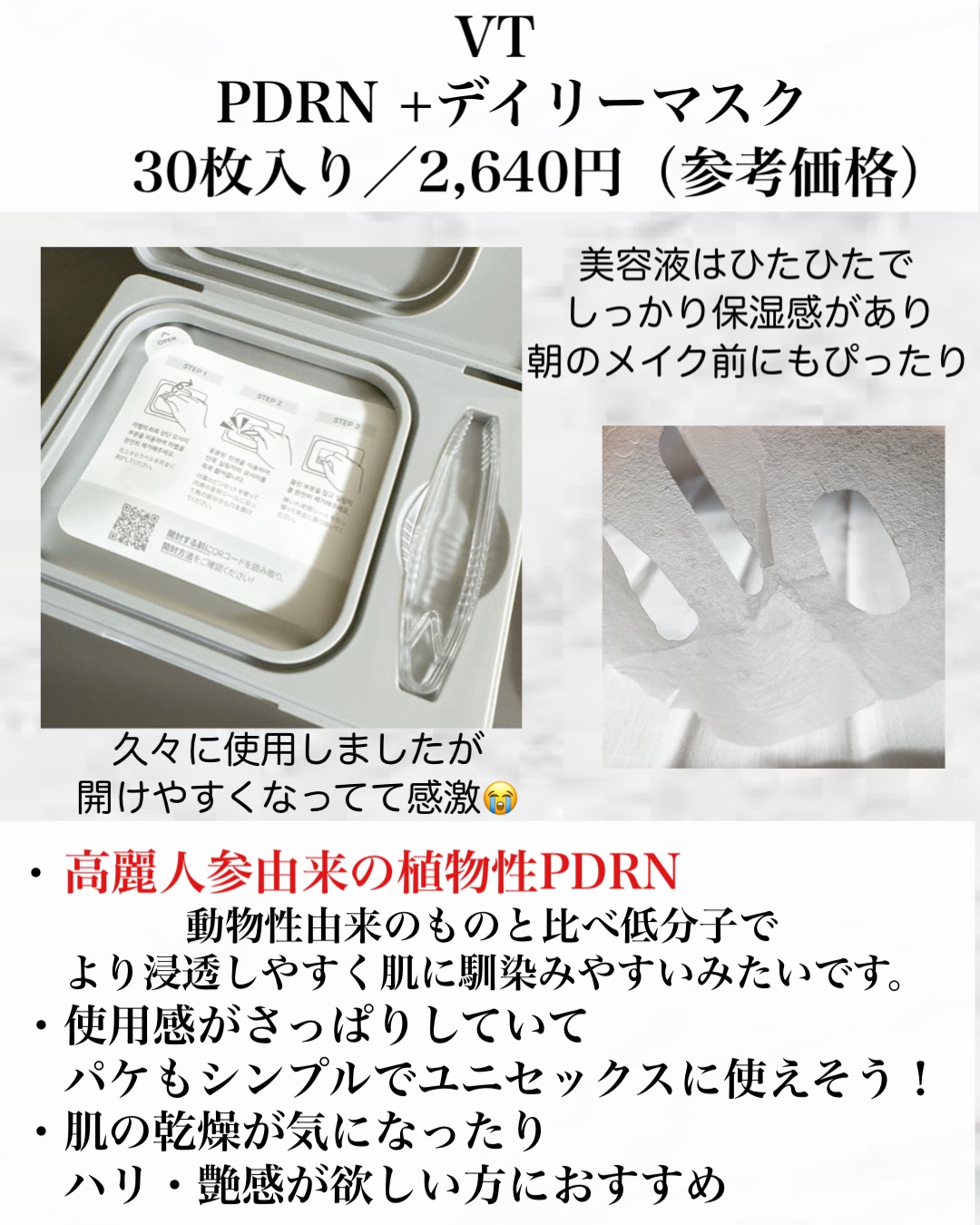 VTさまからいただきました。PDRN+デイリーマスク(30枚入り)しっかりと密封できるケースに入ってるのが嬉しいデイリーマスク✨ピンセット付きで衛生的。上の方のマスクでも美容液がひたひた。薄すぎないシートマスクでしっかり密着。10分から20分...