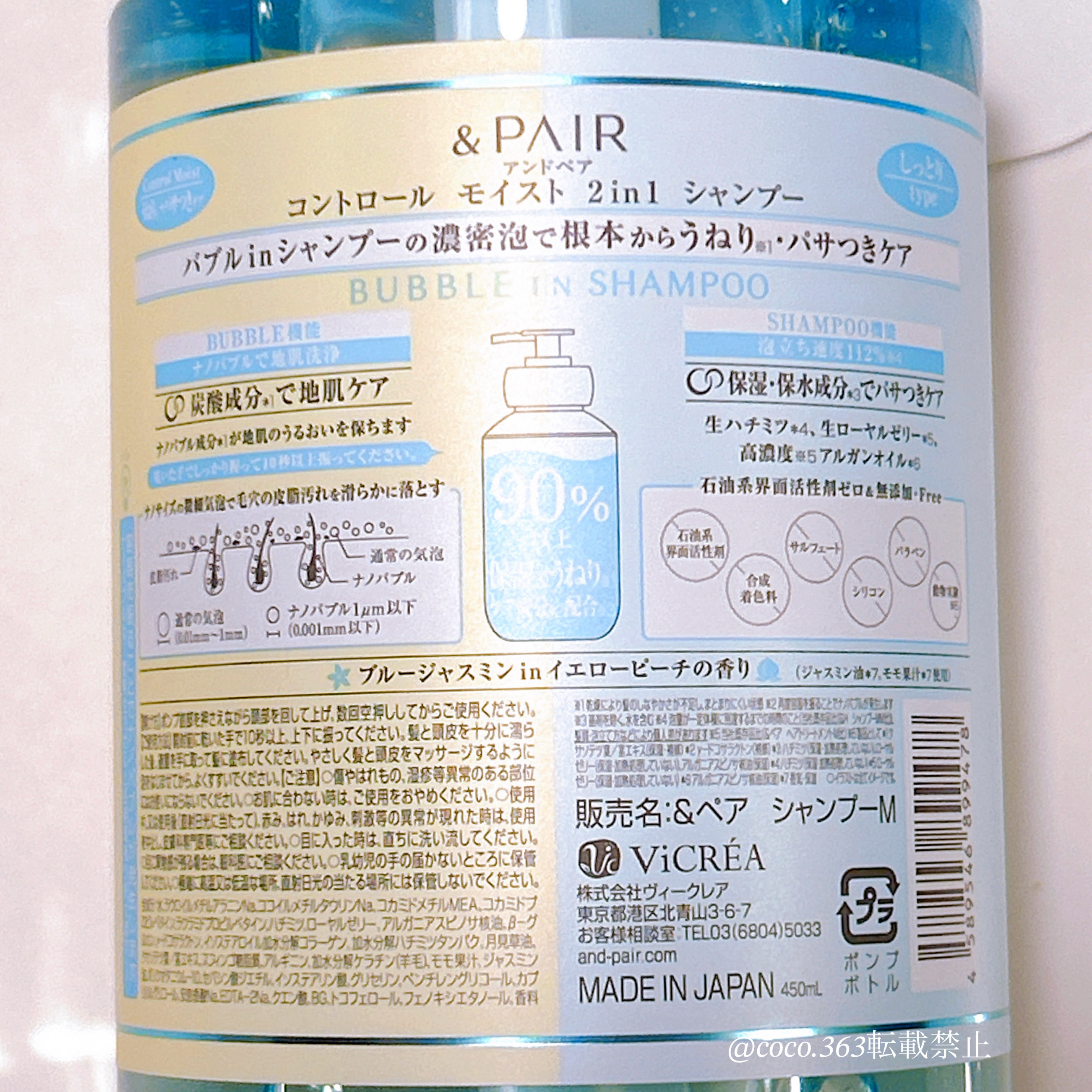 - &PAIRは「タイパ美容」に着目し、1本で2つの機能を持ち合わせたヘアケアブランドです。 コントロール モイストシリーズはうねり※1とパサつきを同時にケアし、しっとりな仕上がりに導きます。 シャンプーにはナノバブルパーツが採用されており、本体を振ることでナノバブルを発生させることができます。 ナノサイズの微細な泡で毛穴の皮脂汚れを滑らかに洗い流します。 ヘアトリートメントは導入ブースター成分*1で保湿成分の浸透をサポートし、 髪のパサつきに浸透保湿ケアができる導入ブースター機能のあるヘアトリートメント。 製品の90%以上が保湿&うねり※1ケア成分*2で構成し※2、指通り滑らかなしっとり髪へ導きます。 石油系洗浄成分不使用・パラベン不使用・動物実験不実施(製品として)・合成着色料不使用・サルフェート不使用(ラウレス硫酸Na)・鉱物油不使用 ※1 乾燥により髪のしなやかさが不足し、まとまりにくい状態 ※2 基剤を除く、水を含む *1 アルギニン、加水分解ケラチン(羊毛)、加水分解ヒアルロン酸(全て保湿) *2 γードコサラクトン(補修)