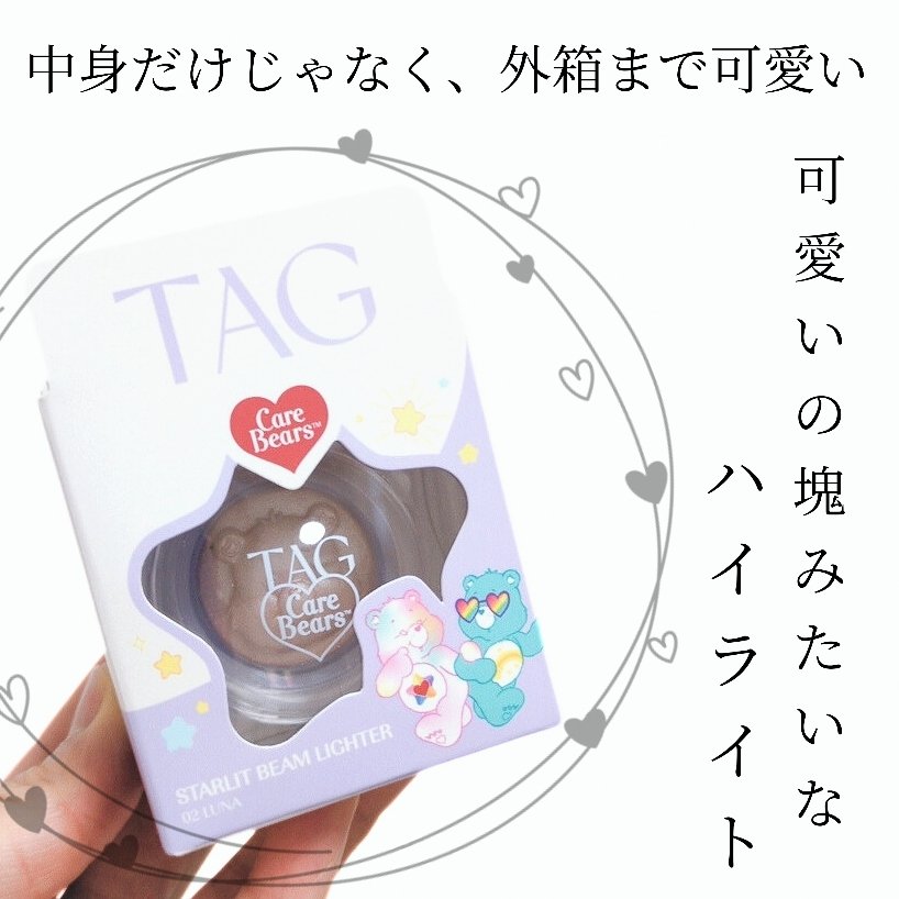 TAGStarlitBeamLighter 発売前からバズってたケアベアコラボが日本でついに発売開始✨02ルナ月の光のもとで輝く砂のように光るシャンペンベージュビーム。シマー&グリッターでお肌に乗せると上品な輝きに。ケアベアの立体的なお顔にガ...
