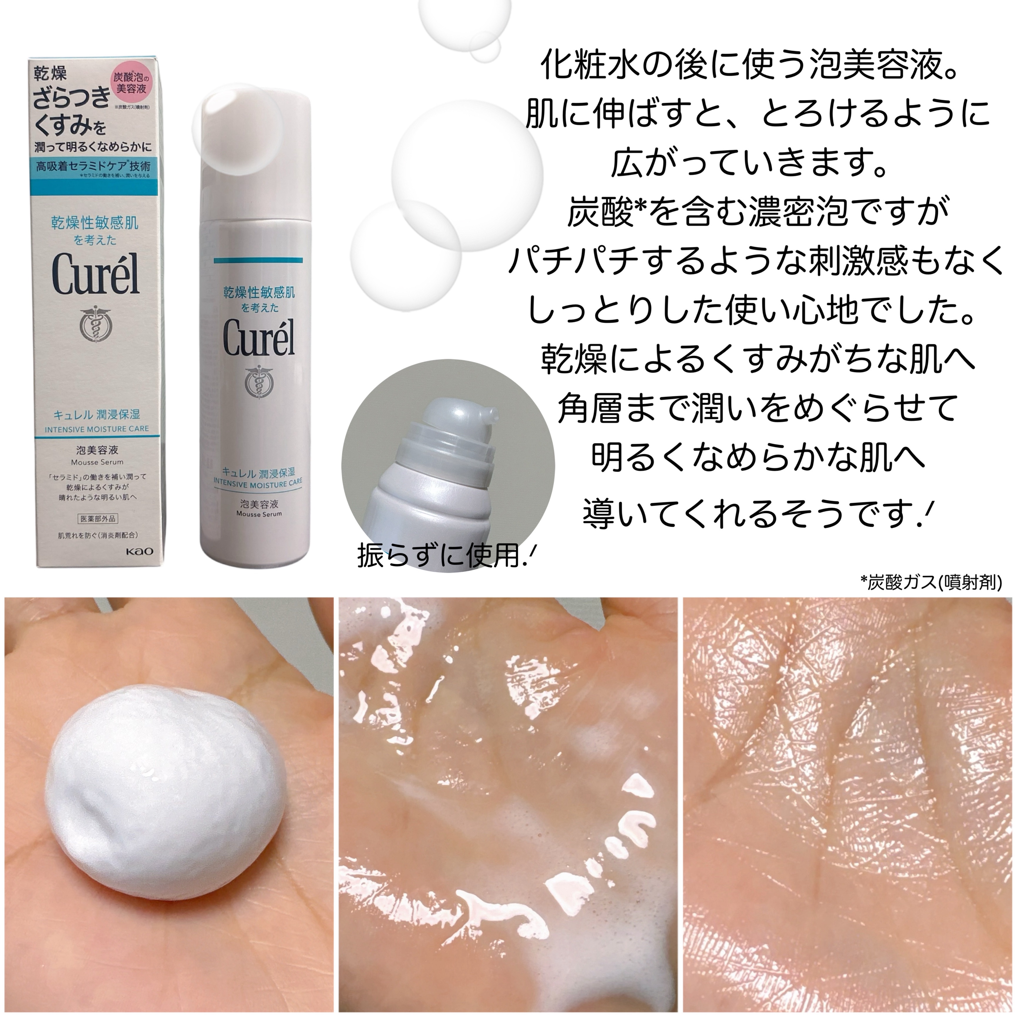 - 【敏感肌用】 乾燥によるざらつきくすみを潤いで満たし、くすみが晴れたような明るいなめらかさのある肌へ導く炭酸*3泡の美容液。 ● 高吸着セラミドケア*2技術 セラミド機能成分*7(保湿)と炭酸*3を含む濃密泡の美容液が、 肌の角層深くまで素早く浸透し保水する ● 潤い成分(セラミド機能成分*7、ユーカリエキス)配合 ● 有効成分(グリチルリチン酸ジカリウム)配合。肌荒れを防ぎます ● 伸ばした瞬間とろけて、肌と一体化するようになじむ使い心地 *2 セラミドの働きを補い、潤いを与える *3 炭酸ガス(噴射剤) *7 ヘキサデシロキシPGヒドロキシエチルヘキサデカナミド <乾燥性敏感肌を考えた低刺激設計> ● 無香料 ● 無着色 ● アルコールフリー(エチルアルコール無添加) ● アレルギーテスト済※ ● 乾燥性敏感肌の方の協力によるパッチテスト済※ パッチテスト:皮膚に対する刺激性を確認するテストです。 ※すべての方にアレルギーや皮膚刺激が起こらないというわけではありません 商品に関するお問い合わせ 受付時間9:00~17:00(土曜・日曜・祝日除く) *製品の誤飲・誤食など緊急の場合は、受付時間外でもお電話ください キュレル:0120-165-698