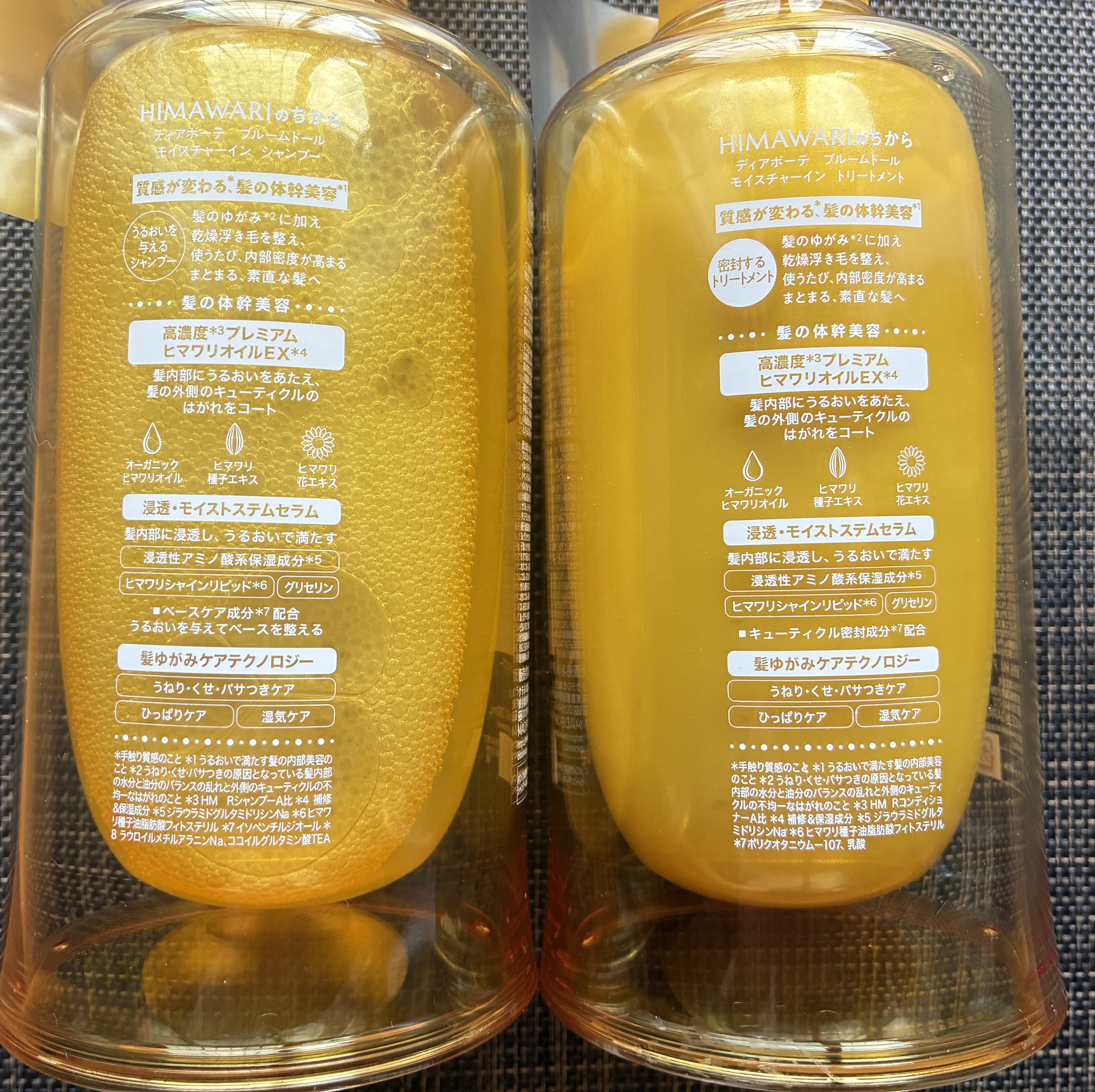 - <シャンプー ポンプ 390ml> 水、ラウラミドプロピルベタイン、ラウロイルメチルアラニンNa、イソペンチルジオール、ココイルグルタミン酸TEA、ヤシ油脂肪酸PEG-7グリセリル、ジラウラミドグルタミドリシンNa、ヒマワリ種子油脂肪酸フィトステリル、グリセリン、ヒマワリ種子油、ヒマワリ種子エキス、ヒマワリ花エキス、ポリクオタニウム-7、ポリクオタニウム-22、クエン酸、ラウリン酸PEG-2、ポリクオタニウム-10、セテアレス-60ミリスチルグリコール、グアーヒドロキシプロピルトリモニウムクロリド、ピロ亜硫酸Na、塩化Na、BG、EDTA-2Na、安息香酸Na、香料 <トリートメント ポンプ 390g> 水、セテアリルアルコール、ジメチコン、グリセリン、ジラウラミドグルタミドリシンNa、ヒマワリ種子油脂肪酸フィトステリル、ポリクオタニウム-107、ヒマワリ種子油、ヒマワリ種子エキス、ヒマワリ花エキス、PPG-2アルギニン、ミツロウ、乳酸、パラフィン、ビスジグリセリルポリアシルアジペート-2、ベヘナミドプロピルジメチルアミン、DPG、グリコシルトレハロース、水添ポリイソブテン、加水分解水添デンプン、イソプロパノール、(PEG-40/PPG-8メチルアミノプロピル/ヒドロキシプロピルジメチコン)コポリマー、ネオペンタン酸イソデシル、ラウレス-4、ラウレス-23、ステアリン酸PEG-55、クエン酸、BG、ステアルトリモニウムクロリド、安息香酸Na、メチルパラベン、香料、カラメル <シャンプー 詰替用 330ml> 水、ラウラミドプロピルベタイン、ラウロイルメチルアラニンNa、イソペンチルジオール、ココイルグルタミン酸TEA、ヤシ油脂肪酸PEG-7グリセリル、ジラウラミドグルタミドリシンNa、ヒマワリ種子油脂肪酸フィトステリル、グリセリン、ヒマワリ種子油、ヒマワリ種子エキス、ヒマワリ花エキス、ポリクオタニウム-7、ポリクオタニウム-22、クエン酸、ラウリン酸PEG-2、ポリクオタニウム-10、セテアレス-60ミリスチルグリコール、グアーヒドロキシプロピルトリモニウムクロリド、ピロ亜硫酸Na、塩化Na、BG、EDTA-2Na、安息香酸Na、香料 <トリートメント 詰替用 330g> 水、セテアリルアルコール、ジメチコン、グリセリン、ジラウラミドグルタミドリシンNa、ヒマワリ種子油脂肪酸フィトステリル、ポリクオタニウム-107、ヒマワリ種子油、ヒマワリ種子エキス、ヒマワリ花エキス、PPG-2アルギニン、ミツロウ、乳酸、パラフィン、ビスジグリセリルポリアシルアジペート-2、ベヘナミドプロピルジメチルアミン、DPG、グリコシルトレハロース、水添ポリイソブテン、加水分解水添デンプン、イソプロパノール、(PEG-40/PPG-8メチルアミノプロピル/ヒドロキシプロピルジメチコン)コポリマー、ネオペンタン酸イソデシル、ラウレス-4、ラウレス-23、ステアリン酸PEG-55、クエン酸、BG、ステアルトリモニウムクロリド、安息香酸Na、メチルパラベン、香料、カラメル
