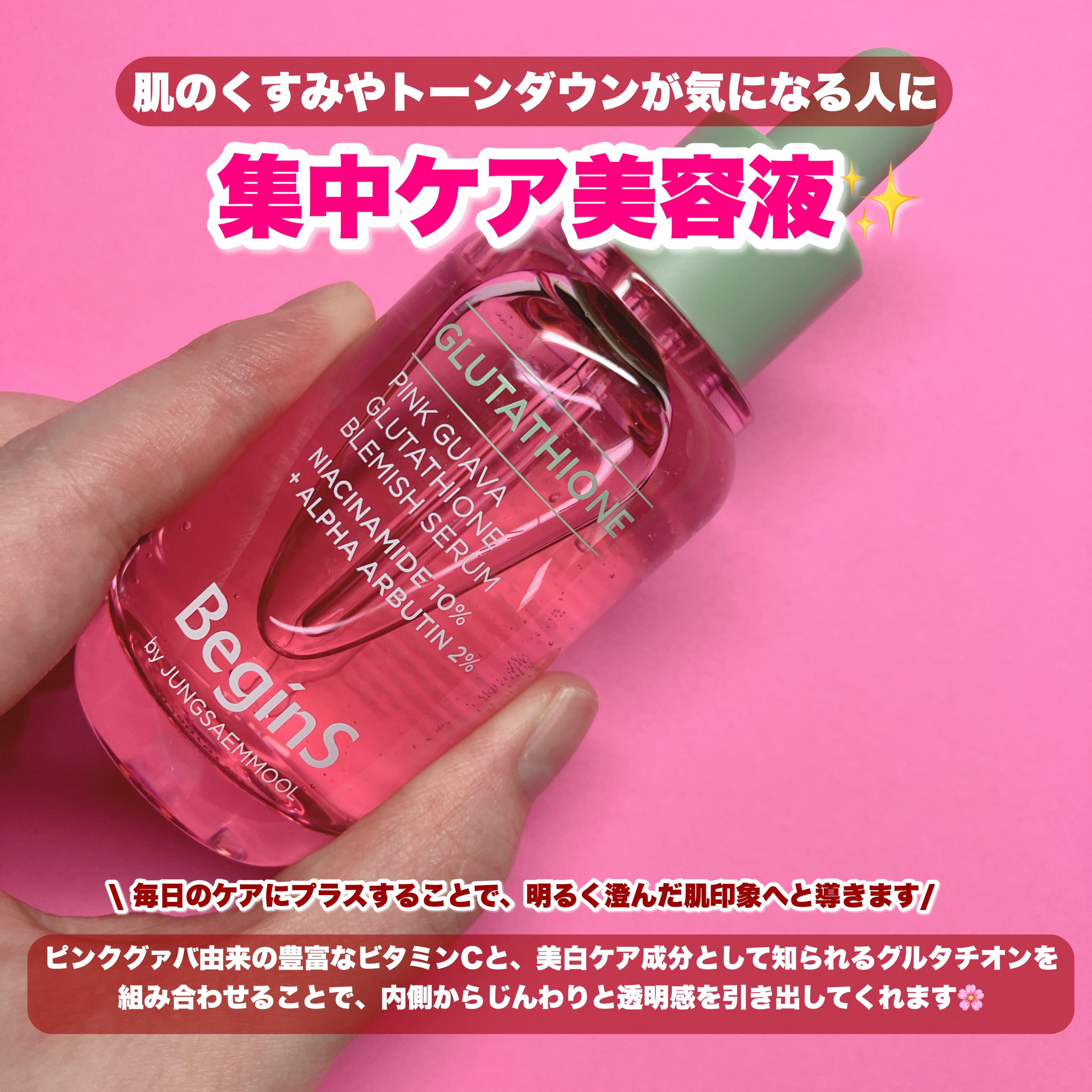 - 1)100時間低温抽出の済州産ピンクグアバ*1使用 みかんの4倍*2、りんごの3倍*2以上のビタミン*3を含む 済州産のピンクグアバを収穫+選別! 2)グルタチオンブレミッシュショット*4™ 純度99%*5のリポソームグルタチオン*6とナイアシンアミド*6などを組み合わせ、 肌をすこやかに保ち、つややかで明るい印象へと導くBegins独自のケア成分コンプレックス *1 グアバ果実エキス(整肌成分) *2 原料的な特性に限る *3 グアバ1個あたりのビタミンC含有量基準 *4ナイアシンアミド、α-アルブチン、グルタチオン、グアバ果実エキス、ヒポファラムノイデス水(すべて保湿成分) *5 純度の数値は配合成分に関する参考地であり、製品の効果を保証するものではありません。 *6整肌成分
