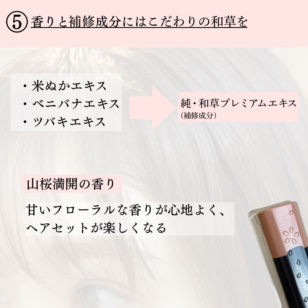 - ●「日本の髪を本質から考える。」ヘアケアブランド ●美しい髪流れをつくる「髪のコスメ」 ●和草のちからでスタイルをつくりながらダメージ補修するスタイリングケアシリーズ ●前髪にコームをサッと通すだけで、根元を立ち上げ、流し前髪を簡単セット&キープ ●「コーム一体型容器」採用 先端にコームが付いた一体型容器で、手ぐし感覚で簡単スタイリング 長め前髪の根元から毛先まで美しい毛流れをつくります。 ●ふんわりまとまりキープ 塗布部から均一に液が染み出すので、だまになりにくく、べたつきません。 パリッとならずに、ふんわり流し前髪をキープします。 ●補修成分「純・和草プレミアムエキス*1」配合 ダメージで失われた、髪のうるおいや艶を補給し、美しい髪へと導きます。 ●みずみずしく可憐に咲く山桜 満開の香り ●バッグに入れやすい持ち運びサイズ ※日本の髪を本質から考える:日本の風土や気候などの環境に合わせたヘアケア方法を研究しています。 *1:米ぬかエキス・ツバキエキス・ベニバナエキス 〇ペンを持つように容器を持ちます。 コーム部分で髪をとかしながら、髪の流れを作りたい方向に3~5回程通す。 前髪を立ち上げたいときは、根元にコーム部分を差し込み、髪をかきあげながら、コームを毛先まで通していく ※容器を頭皮に対して立てて、ゆっくり髪を通してください。 クシの先で頭皮を傷めないようにしてください。 キャップを開ける際や容器を振ると液が飛び散ることがありますのでご注意ください。 締まりがゆるいと、コーム部分が乾燥して使用できなくなります。容器は横向きまたはキャップを下にして保管してください。