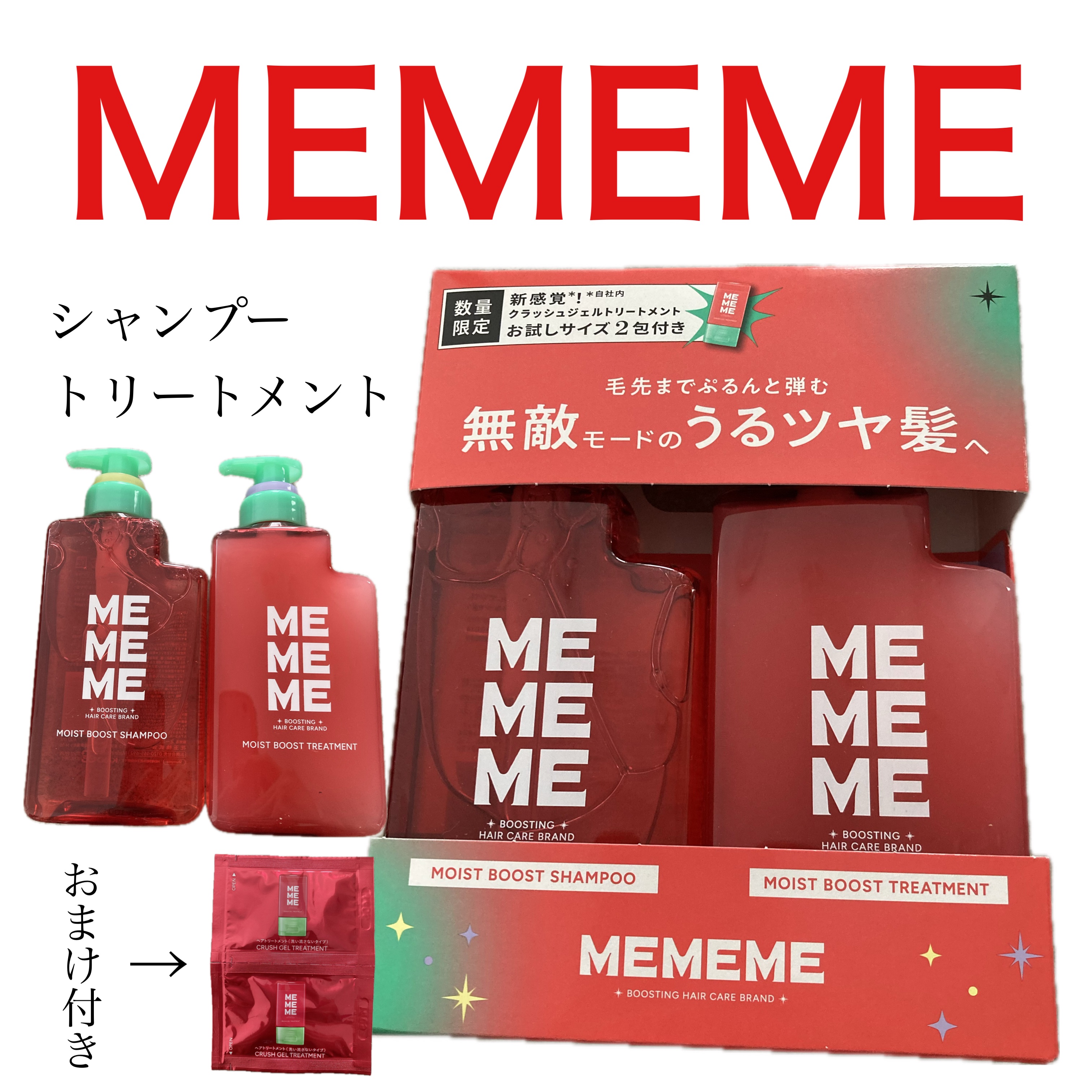 ✴︎MEMEMEモイストブーストシャンプーモイストブーストトリートメントレッド×グリーンのパケがかわいい新作シャントリが花王から発売となりました❤️💚髪も気分も弾むブーストケア体験とのことで、特別なケアをしなくても無敵モードのうるツヤ髪へと導...
