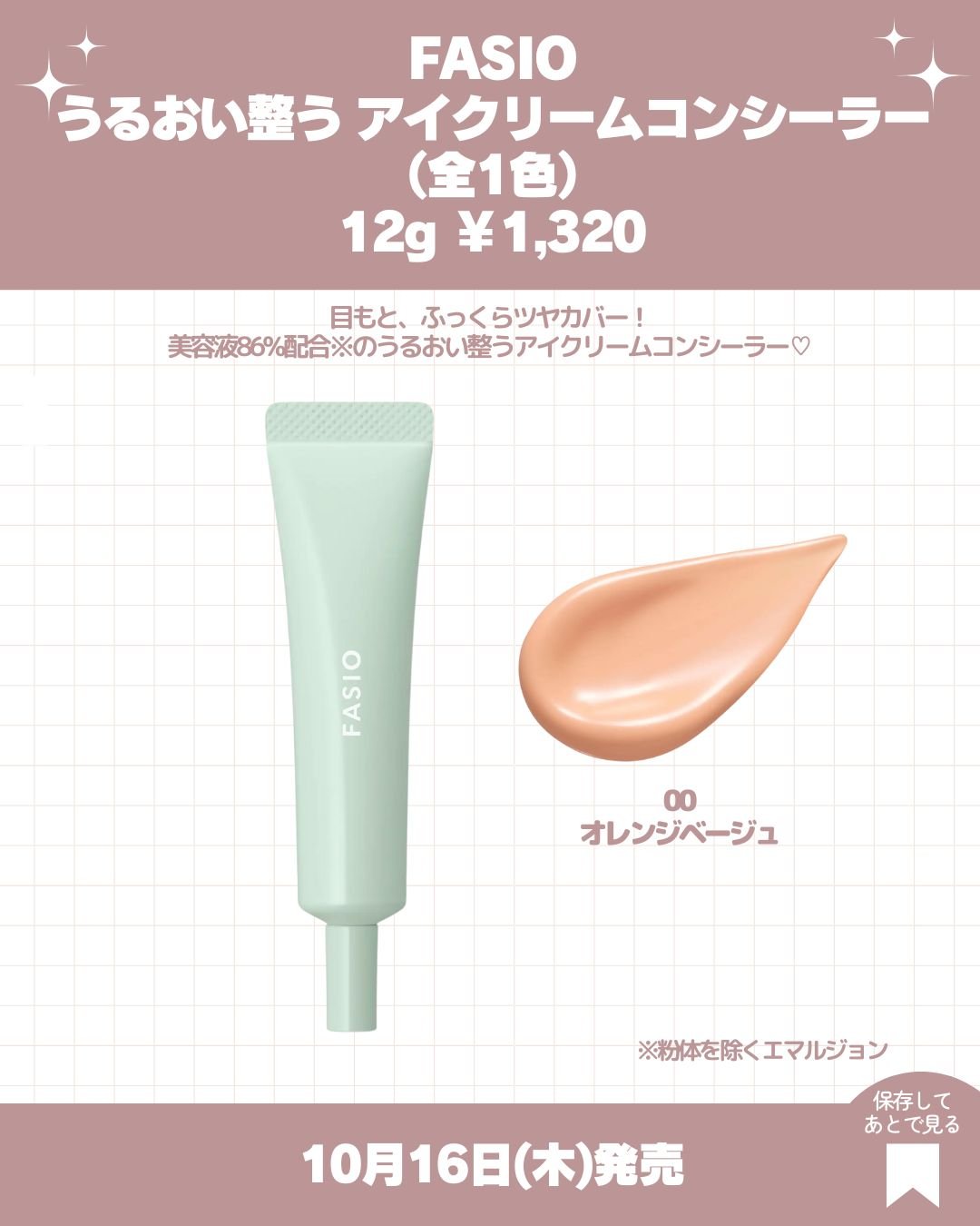FASIO新作情報⟡.·*.··············································⟡.·*.発売日10/16新コンセプトはキレイの即戦力♥うるおい整うアイクリームコンシーラー1.320円目もと、ふっくらツ...