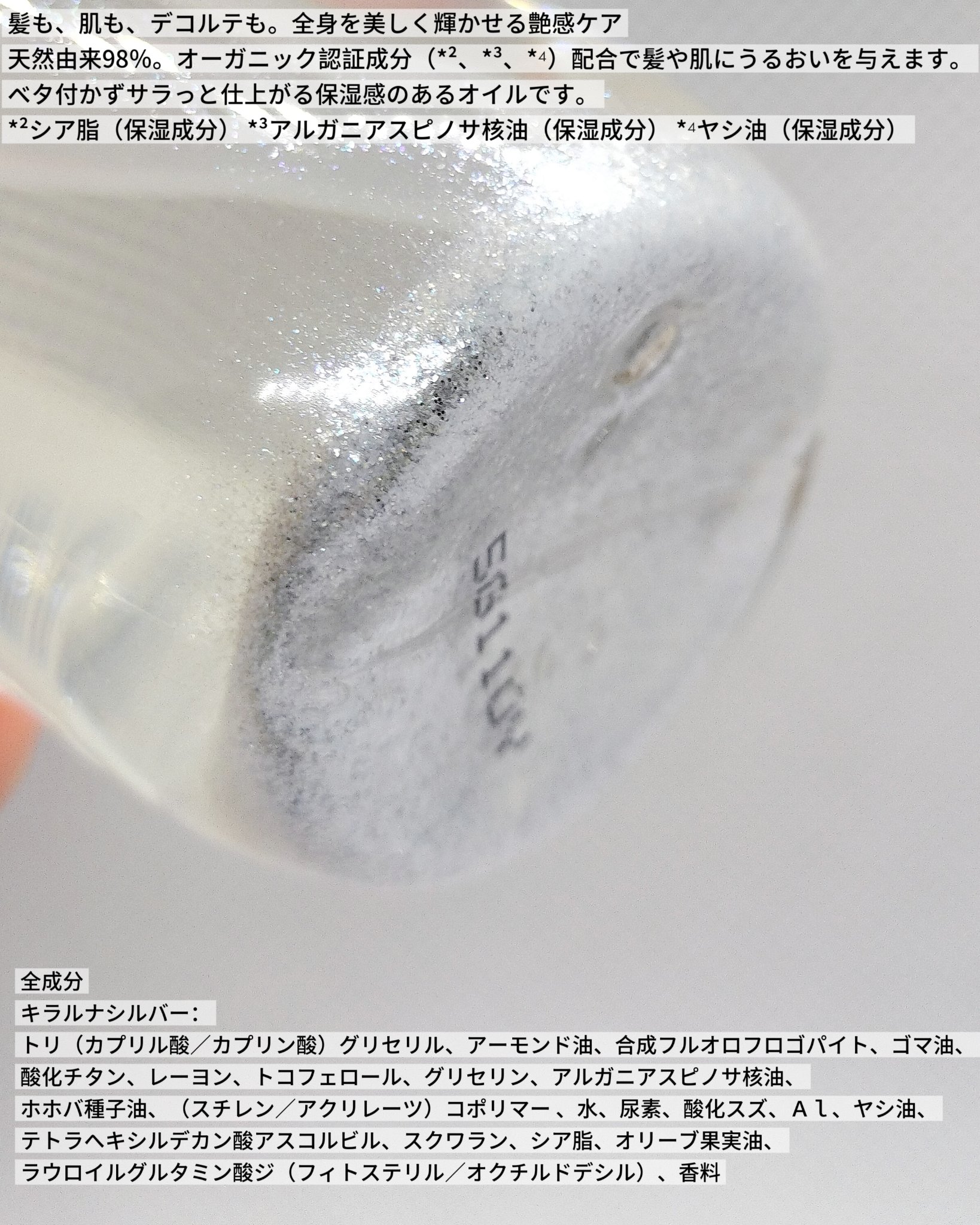 - <ピカオーラゴールド> トリ(カプリル酸/カプリン酸)グリセリル、コメヌカ油、合成フルオロフロゴパイト、ゴマ油、酸化チタン、レーヨン、トコフェロール、グリセリン、アルガニアスピノサ核油、ホホバ種子油、水、セラック、尿素、マイカ、酸化鉄、酸化スズ、ヤシ油、テトラヘキシルデカン酸アスコルビル、スクワラン、シア脂、オリーブ果実油、ラウロイルグルタミン酸ジ(フィトステリル/オクチルドデシル)、香料 <キラルナシルバー> トリ(カプリル酸/カプリン酸)グリセリル、アーモンド油、合成フルオロフロゴパイト、ゴマ油、酸化チタン、レーヨン、トコフェロール、グリセリン、アルガニアスピノサ核油、ホホバ種子油、(スチレン/アクリレーツ)コポリマー、水、尿素、酸化スズ、Al、ヤシ油、テトラヘキシルデカン酸アスコルビル、スクワラン、シア脂、オリーブ果実油、ラウロイルグルタミン酸ジ(フィトステリル/オクチルドデシル)、香料