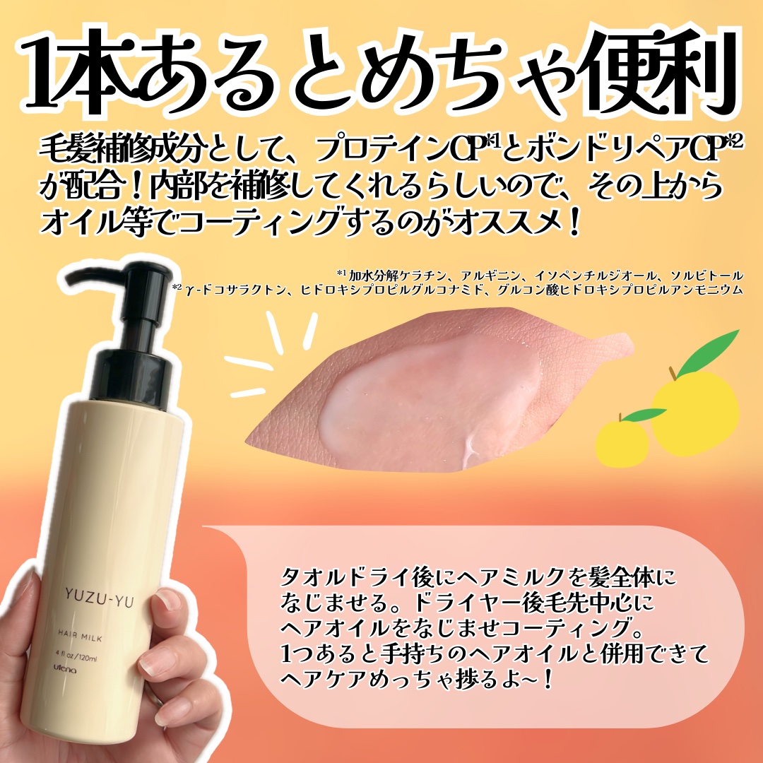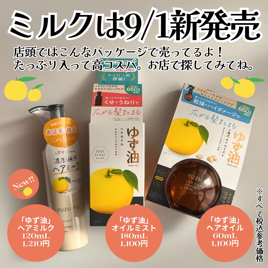 アホ毛・枝毛もするん♡「ゆず油」シリーズからヘアミルク登場!9/1発売———-♡——————–♡———ゆず油ヘアミルク120ml1,210円(税込)———-♡——————–♡———大人気のゆず油シリーズにヘアミルク登場!蓄積ダメージによるあほ...