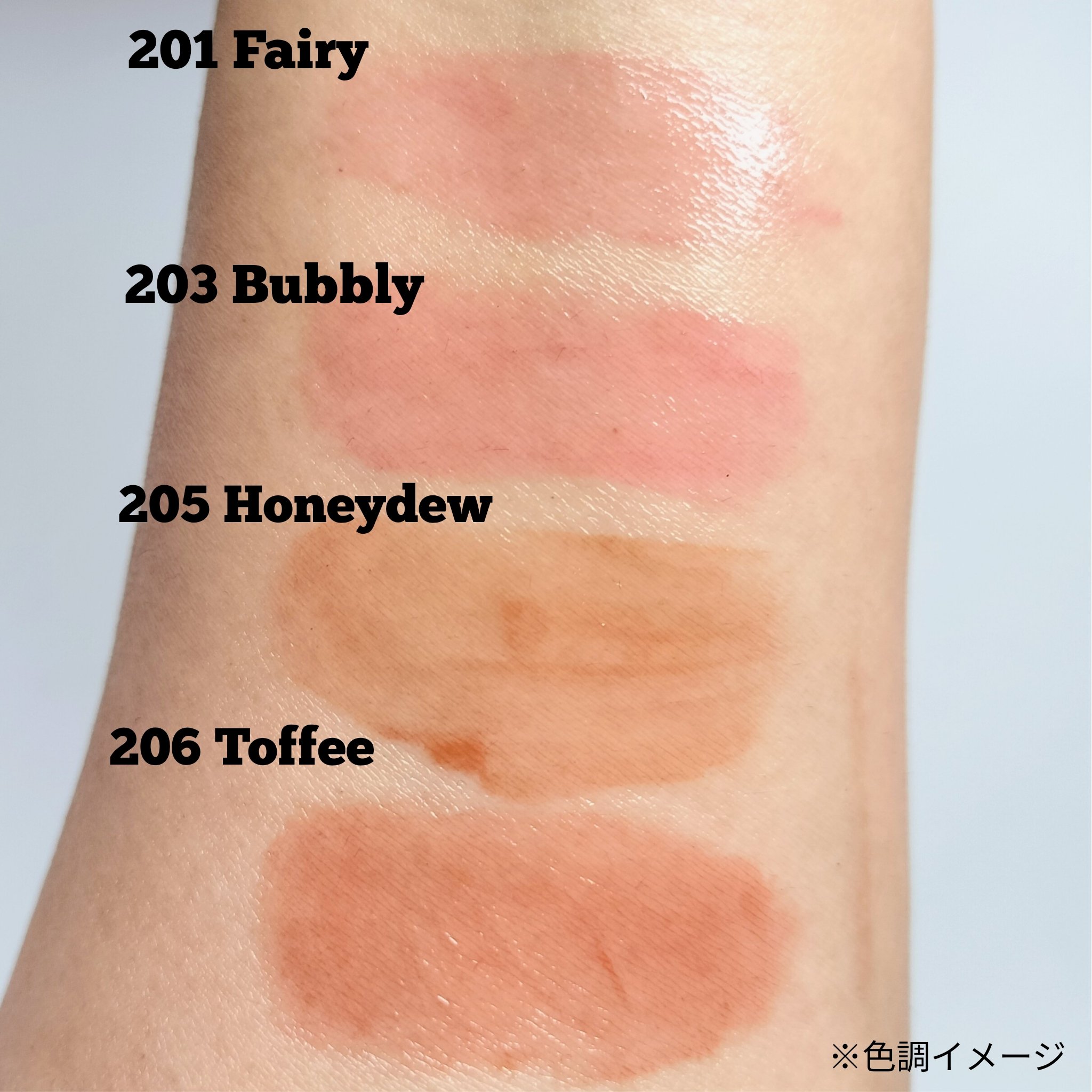 - <201 フェアリー> ダイマージリノール酸ジイソステアリル、ジフェニルシロキシフェニルトリメチコン、ビスジグリセリルポリアシルアジペート-2、水、ジフェニルジメチコン、水添ポリイソブテン、セチルPEG/PPG-10/1ジメチコン、ポリソルベート60、ペンチレングリコール、グリセリン、イソステアリン酸ポリグリセリル-4、フェノキシエタノール、1,2-ヘキサンジオール、セテアレス-20、酸化チタン (CI 77891)、(アクリル酸ヒドロキシエチル/アクリロイルジメチルタウリンNa)コポリマー、ステビオシド、スクワラン、香料、ジラウラミドグルタミドリシンNa、エチルヘキシルグリセリン、エチレンジアミンジコハク酸3Na、赤色227号 (CI 17200)、水酸化Al、黄色5号 (CI 15985)、ポリアクリル酸アンモニウム、イソステアリン酸ソルビタン、黄色4号 (CI 19140)、BG、赤色223号 (CI 45410)、青色1号 (CI 42090)、アラントイン、パンテノール、ツボクサエキス、ヒアルロン酸、加水分解ヒアルロン酸、ヒアルロン酸Na <203 バブリー> ダイマージリノール酸ジイソステアリル、ジフェニルシロキシフェニルトリメチコン、ビスジグリセリルポリアシルアジペート-2、水、ジフェニルジメチコン、水添ポリイソブテン、セチルPEG/PPG-10/1ジメチコン、ポリソルベート60、ペンチレングリコール、グリセリン、イソステアリン酸ポリグリセリル-4、フェノキシエタノール、1,2-ヘキサンジオール、セテアレス-20、(アクリル酸ヒドロキシエチル/アクリロイルジメチルタウリンNa)コポリマー、ステビオシド、酸化チタン (CI 77891)、スクワラン、香料、ジラウラミドグルタミドリシンNa、エチルヘキシルグリセリン、赤色227号 (CI 17200)、エチレンジアミンジコハク酸3Na、黄色5号 (CI 15985)、イソステアリン酸ソルビタン、水酸化Al、ポリアクリル酸アンモニウム、黄色4号 (CI 19140)、BG、青色1号 (CI 42090)、アラントイン、パンテノール、ツボクサエキス、ヒアルロン酸、加水分解ヒアルロン酸、ヒアルロン酸Na <204 レア> ダイマージリノール酸ジイソステアリル、ジフェニルシロキシフェニルトリメチコン、ビスジグリセリルポリアシルアジペート-2、水、ジフェニルジメチコン、水添ポリイソブテン、セチルPEG/PPG-10/1ジメチコン、ポリソルベート60、ペンチレングリコール、グリセリン、イソステアリン酸ポリグリセリル-4、フェノキシエタノール、1,2-ヘキサンジオール、セテアレス-20、(アクリル酸ヒドロキシエチル/アクリロイルジメチルタウリンNa)コポリマー、酸化チタン (CI 77891)、ステビオシド、スクワラン、香料、ジラウラミドグルタミドリシンNa、エチルヘキシルグリセリン、赤色227号 (CI 17200)、黄色5号 (CI 15985)、エチレンジアミンジコハク酸3Na、イソステアリン酸ソルビタン、水酸化Al、ポリアクリル酸アンモニウム、黄色4号 (CI 19140)、青色1号 (CI 42090)、BG、アラントイン、パンテノール、ツボクサエキス、ヒアルロン酸、加水分解ヒアルロン酸、ヒアルロン酸Na <205 ハニーデュー> ダイマージリノール酸ジイソステアリル、ジフェニルシロキシフェニルトリメチコン、ビスジグリセリルポリアシルアジペート-2、水、ジフェニルジメチコン、水添ポリイソブテン、セチルPEG/PPG-10/1ジメチコン、ポリソルベート60、ペンチレングリコール、グリセリン、イソステアリン酸ポリグリセリル-4、フェノキシエタノール、1,2-ヘキサンジオール、セテアレス-20、(アクリル酸ヒドロキシエチル/アクリロイルジメチルタウリンNa)コポリマー、酸化チタン (CI 77891)、ステビオシド、スクワラン、香料、ジラウラミドグルタミドリシンNa、エチルヘキシルグリセリン、赤色227号 (CI 17200)、黄色5号 (CI 15985)、エチレンジアミンジコハク酸3Na、イソステアリン酸ソルビタン、水酸化Al、ポリアクリル酸アンモニウム、黄色4号 (CI 19140)、青色1号 (CI 42090)、BG、アラントイン、パンテノール、ツボクサエキス、ヒアルロン酸、加水分解ヒアルロン酸、ヒアルロン酸Na <206 トフィー> ダイマージリノール酸ジイソステアリル、ジフェニルシロキシフェニルトリメチコン、ビスジグリセリルポリアシルアジペート-2、水、ジフェニルジメチコン、水添ポリイソブテン、セチルPEG/PPG-10/1ジメチコン、ポリソルベート60、ペンチレングリコール、グリセリン、イソステアリン酸ポリグリセリル-4、フェノキシエタノール、1,2-ヘキサンジオール、セテアレス-20、(アクリル酸ヒドロキシエチル/アクリロイルジメチルタウリンNa)コポリマー、ステビオシド、スクワラン、香料、ジラウラミドグルタミドリシンNa、酸化チタン (CI 77891)、エチルヘキシルグリセリン、黄色5号 (CI 15985)、エチレンジアミンジコハク酸3Na、黄色4号 (CI 19140)、赤色227号 (CI 17200)、イソステアリン酸ソルビタン、赤色223号 (CI 45410)、青色1号 (CI 42090)、水酸化Al、ポリアクリル酸アンモニウム、BG、アラントイン、パンテノール、ツボクサエキス、ヒアルロン酸、加水分解ヒアルロン酸、ヒアルロン酸Na <207 フレイム> ダイマージリノール酸ジイソステアリル、ジフェニルシロ