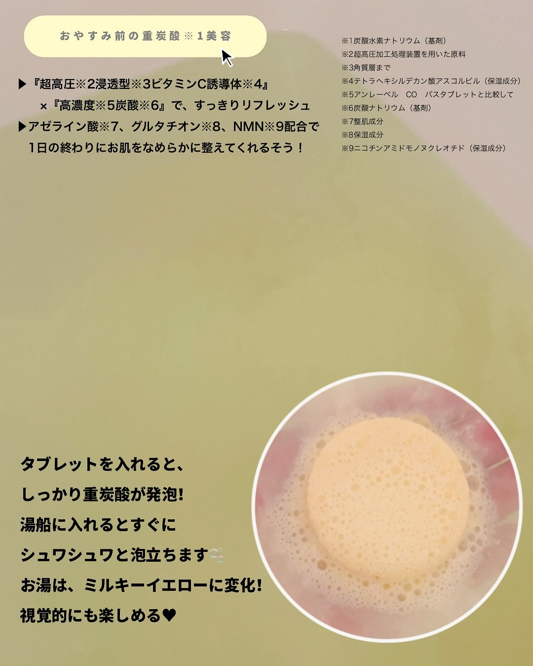 .アンレーベルラボVコンプリートバスタブレットおやすみ前の重炭酸*1美容🌙✨超高圧*2浸透型*3ビタミンC誘導体*4配合、高濃度*5炭酸*6が特徴のバスタブレットですさらにアゼライン酸*7、グルタチオン*8、NMN*9も配合されています...