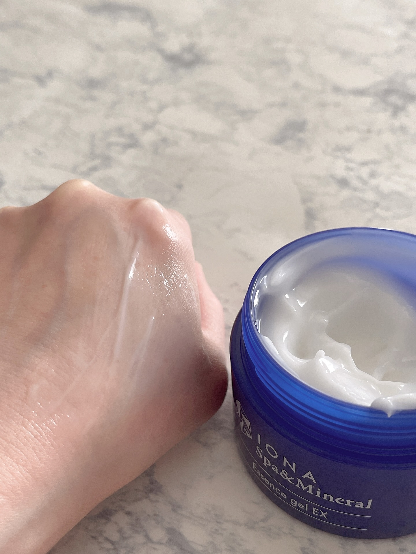 「イオナスパ&ミネラル エッセンスジェルEX」 美容液ジェル 80gトロリと濃密なオールインワンジェルです濃い青の、使いやすいジャータイプの容器に入っています✨手に取ってみると、トロリとした白いジェルクリームです✨なめらかで濃厚なテ...