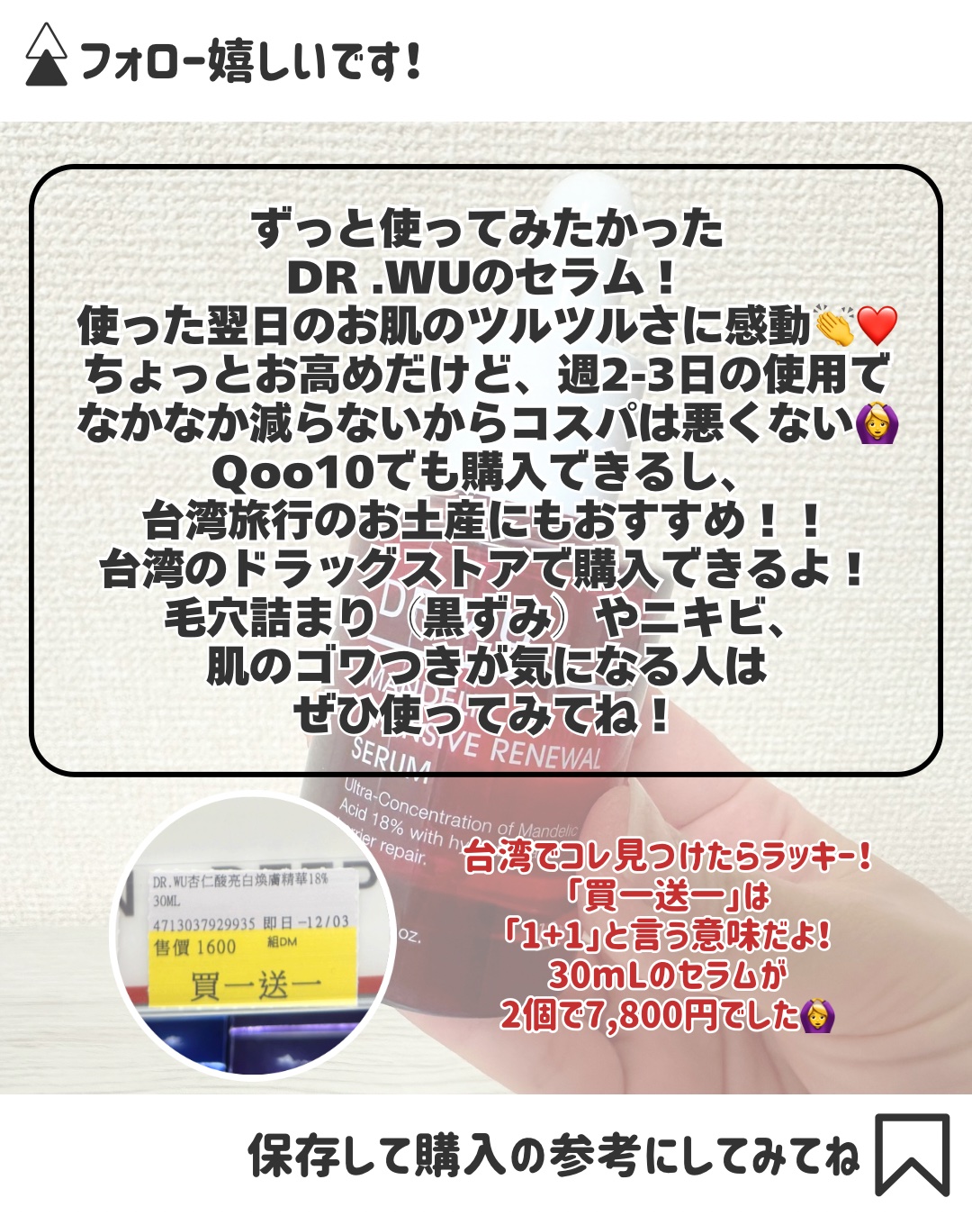敏感肌でも使える毛穴・角質のスペシャルケア ビターアーモンドから抽出した純度99.9%のマンデル酸(杏仁酸)を配合 DR.WUは台湾NO.1ドクターズコスメブランドで、皮膚科医によって設立されたブランド 通称夜に仕込むつるツヤ美容液と呼ばれているそう✨