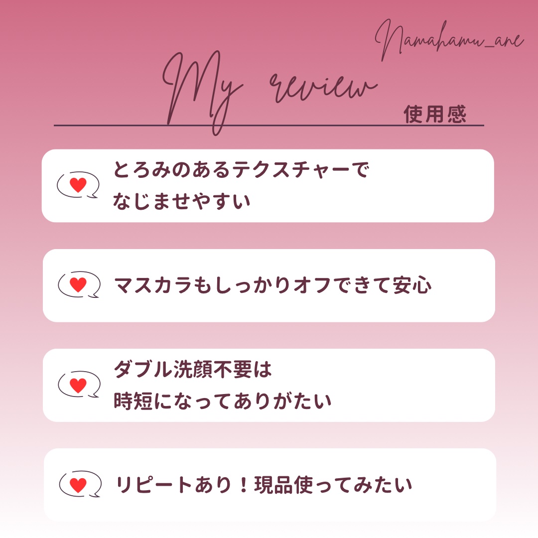 | クレンジングランキング第27位 | 念入りにゴシゴシしなくてもスルッと落ちてくれました。洗い上がりはしっとりしてて、急いでスキンケアしなきゃ!!ってならない。 | 詳細を見る | |